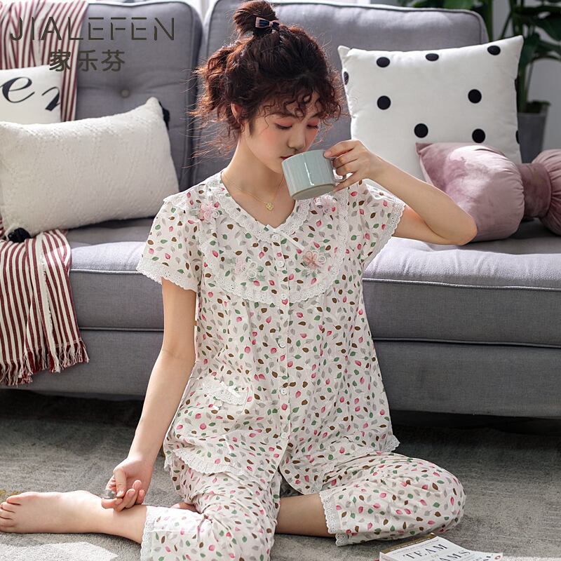 ウーブンコットンガーゼパジャマレディースサマーコットン半袖パンツホームサービスサマーシンマザーカーディガンスーツ jial63022680094