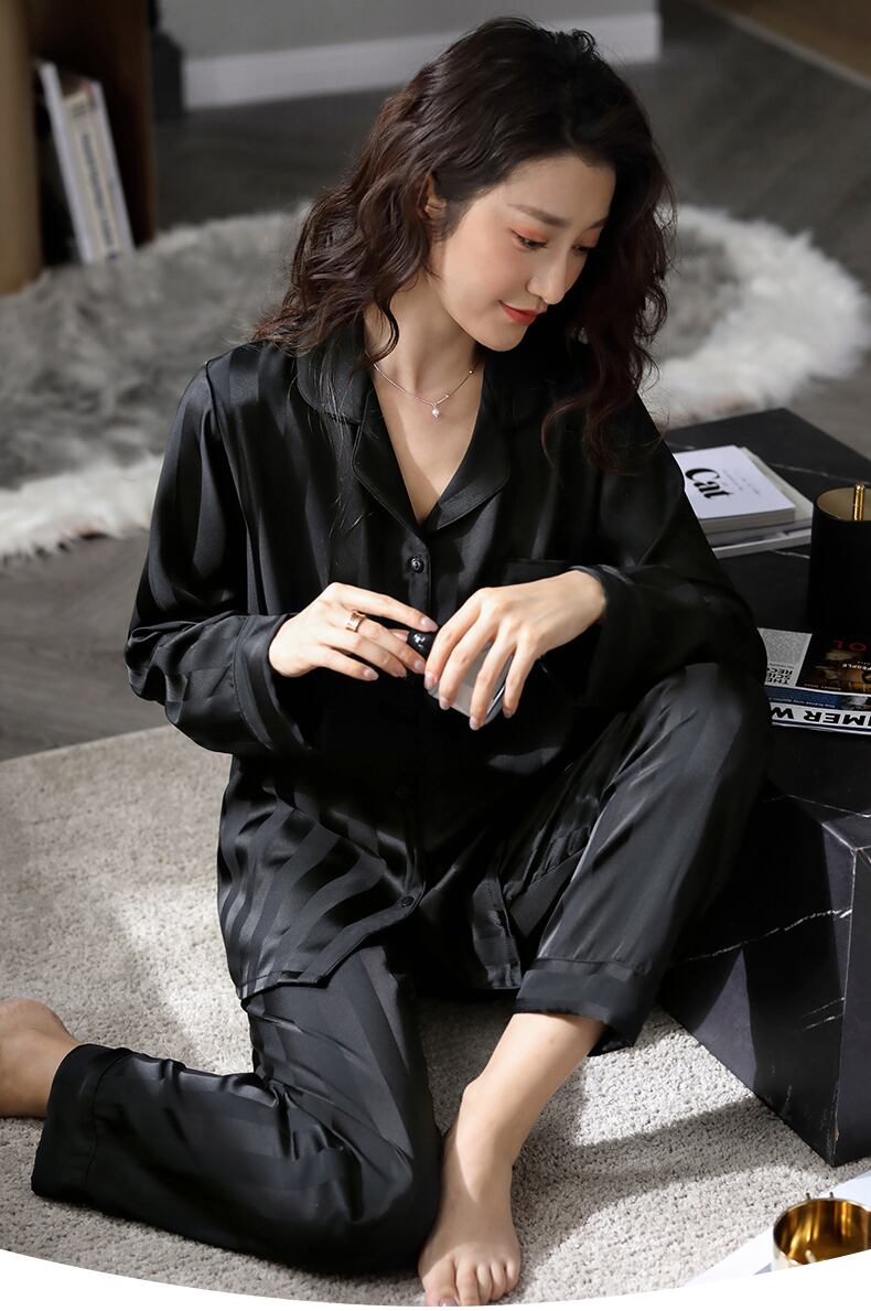 パジャマレディース春夏シルクアイスシルク長袖ホームサービス春秋秋薄片模造シルクブラックスーツ jial8189754877