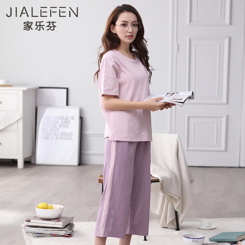 パジャマレディースサマーコットン半袖はレジャー夏外出可能ワイドレッグパンツクロップドパンツホームサービスツーピーススーツ jial24237109549