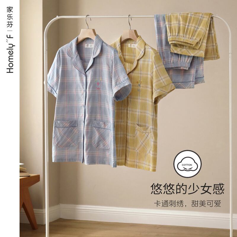 ウーブンコットンガーゼパジャマレディースサマーコットン半袖パンツホームサービスサマーシンコットンチェック柄カーディガン jial28302979021