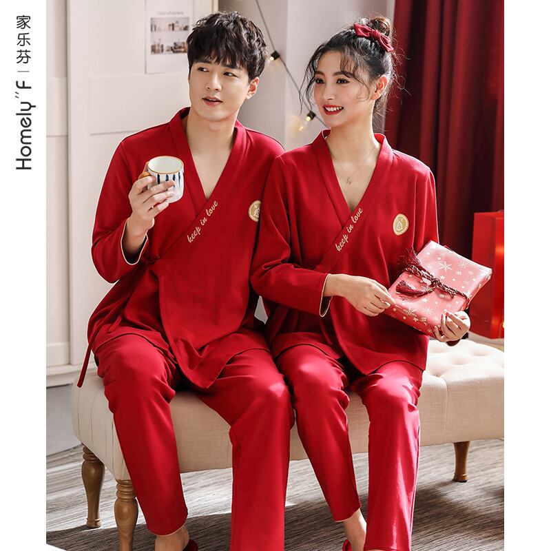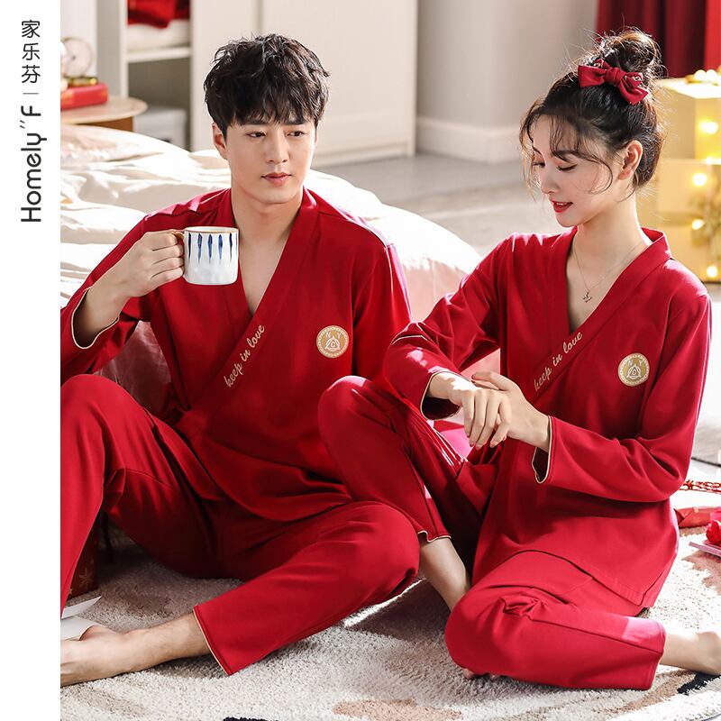 結婚式のパジャマ新婚カップルは赤い綿の長袖の女性の家庭服男性の春と秋の着物eseスタイルに合います jial73526390405