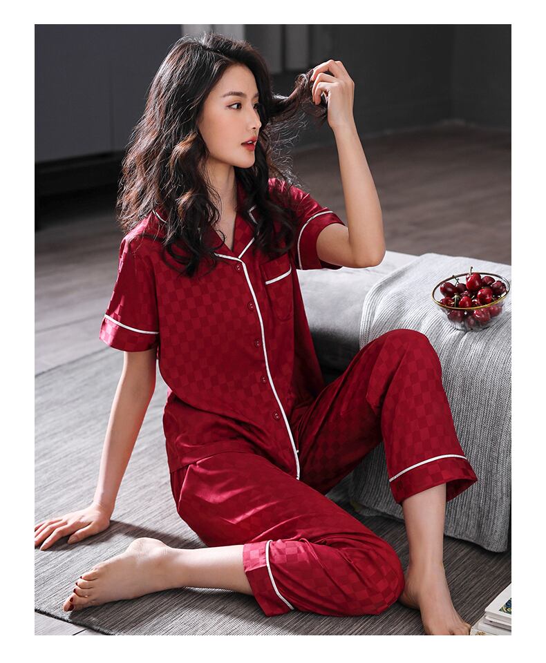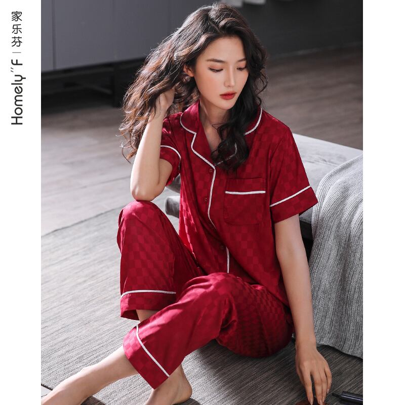 パジャマレディースサマーシルクアイスシルク半袖パンツラウンジウェアサマーシンイミテーションシルクカーディガンツーピーススーツ jial27460823363