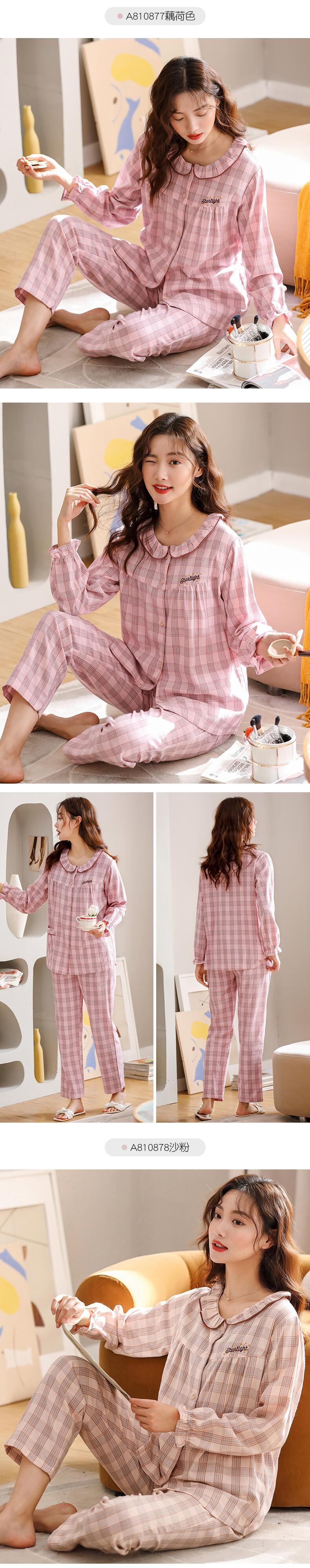 ウーブンコットンガーゼパジャマレディース春夏コットン長袖ホームウェアコットン春秋薄片春チェック柄 jial73532582965