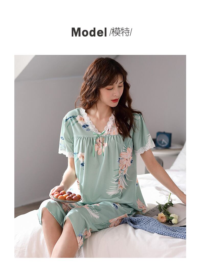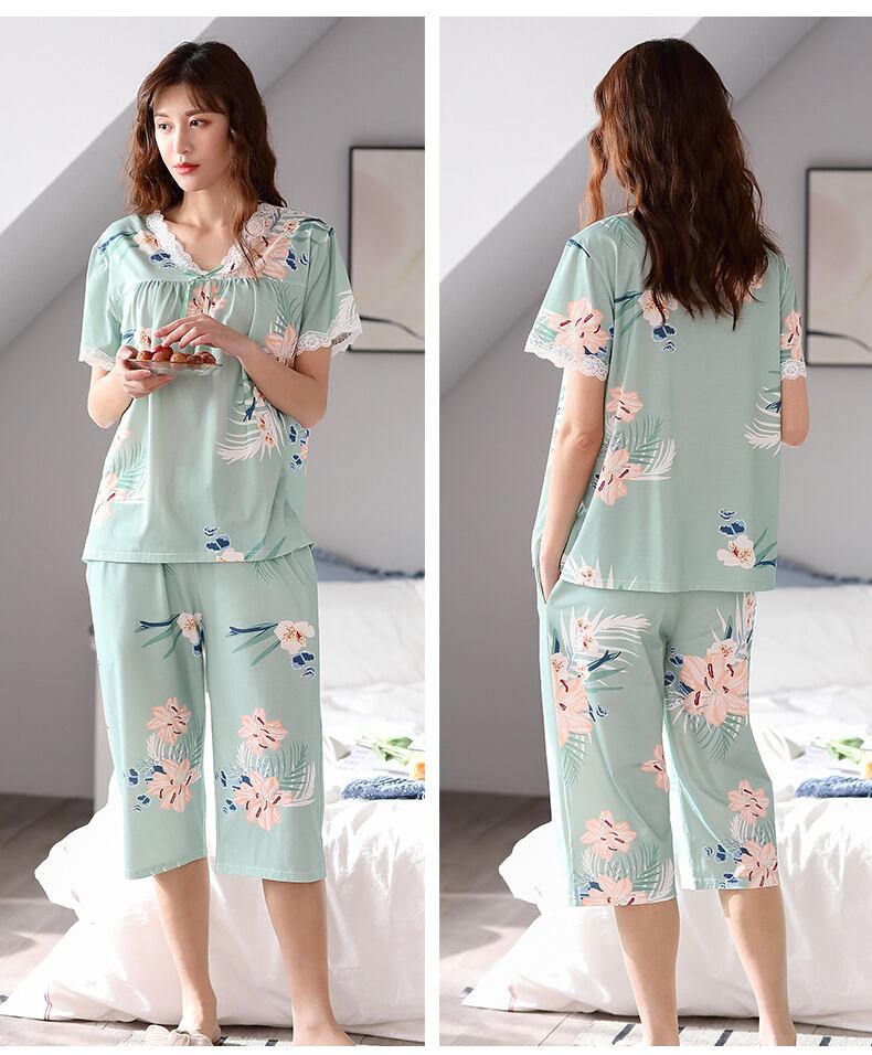 パジャマサマーコットン半袖クロップドパンツホームウェアサマーシンコットンミドルエイジドママラージサイズスーツ jial77033450056