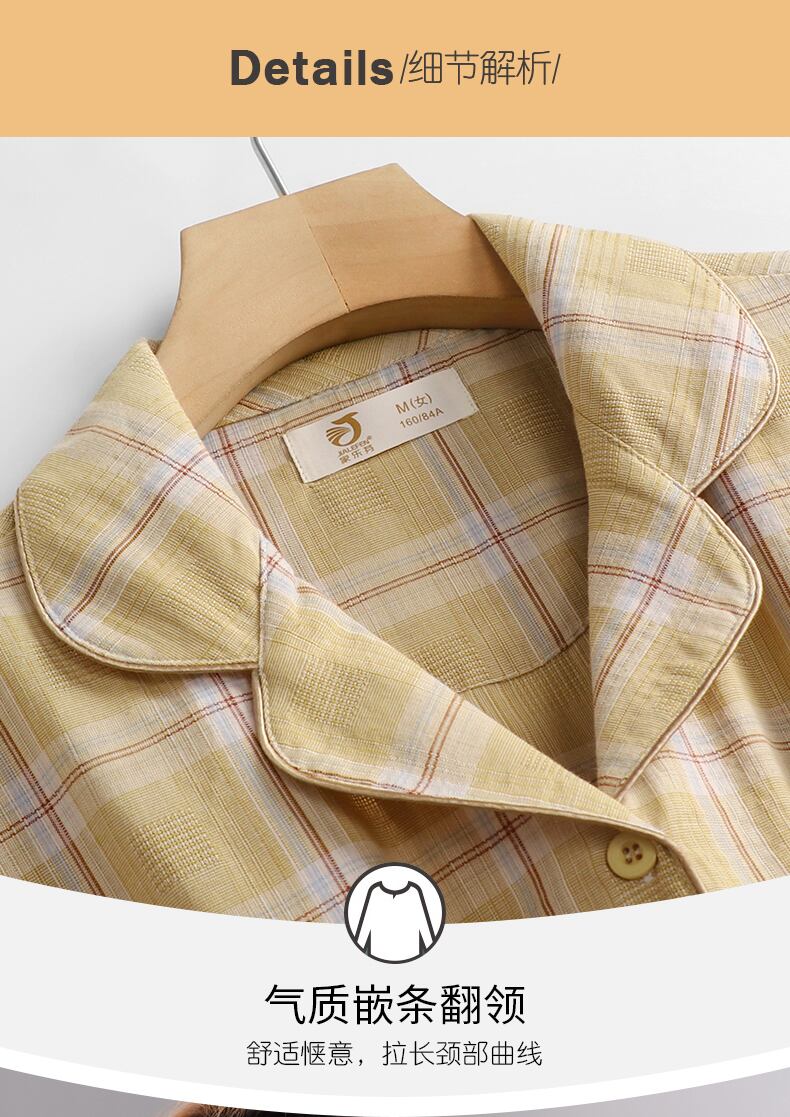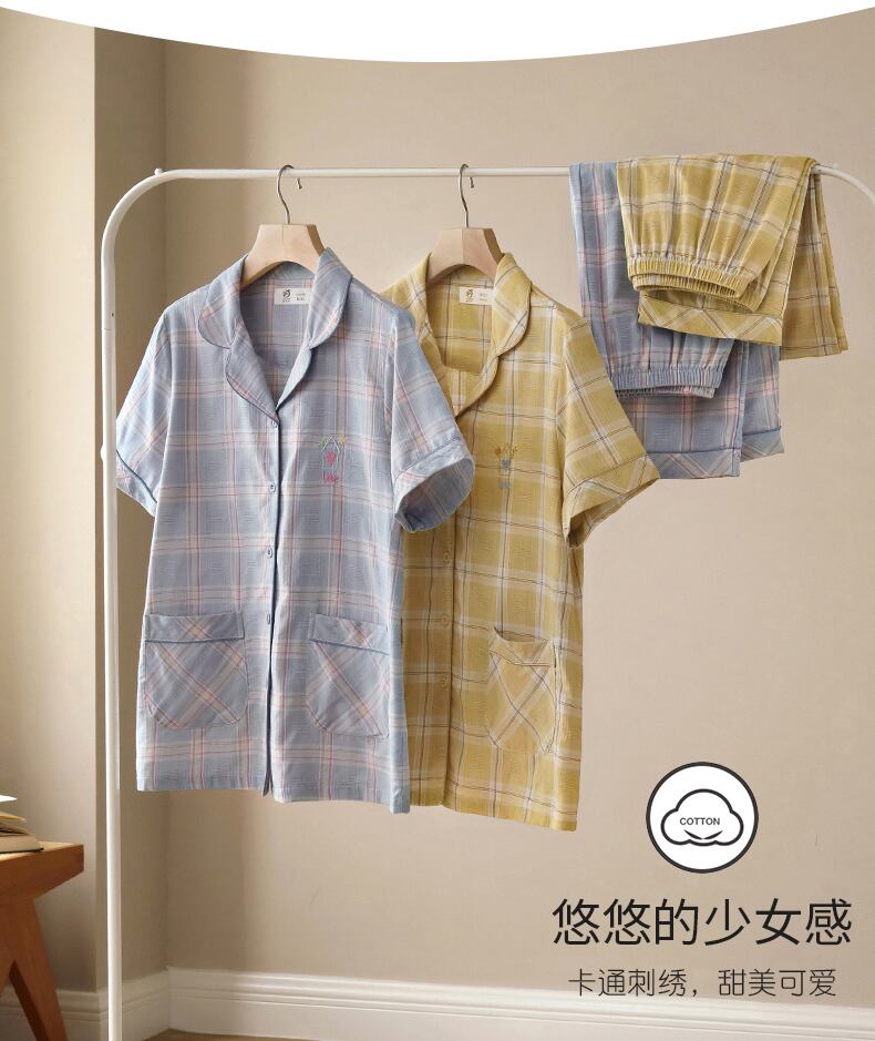 織り綿ガーゼパジャマレディース夏綿半袖ズボン家庭用品夏薄綿格子縞スーツ jial76453788533