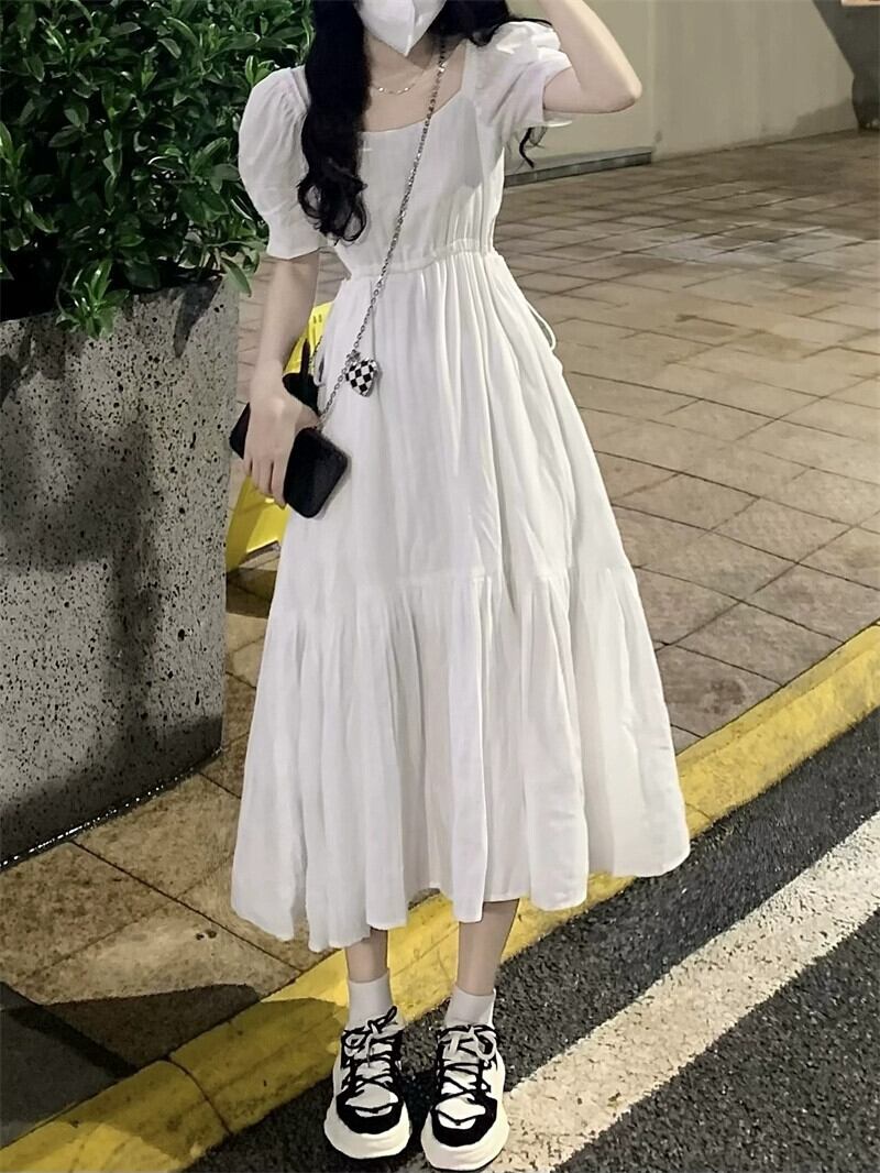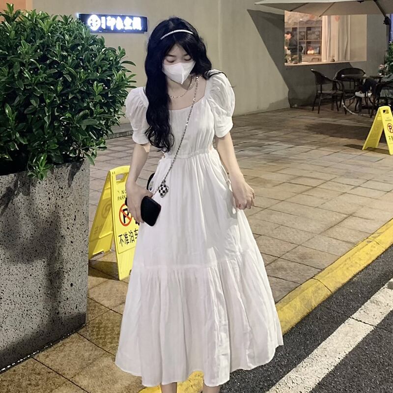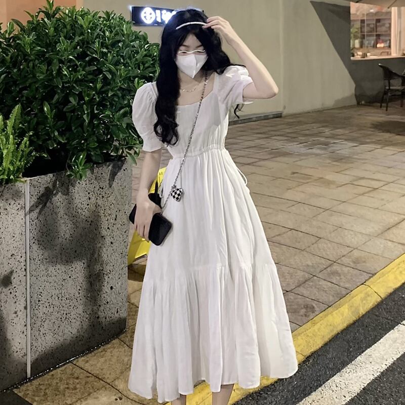 ヘップバーンスタイルスクエアカラーウエストドレス夏 2023 新しいスリムウエストデザインパフスリーブミドル丈スカート女性 サマー 夏物 スクウェア missk15260608200