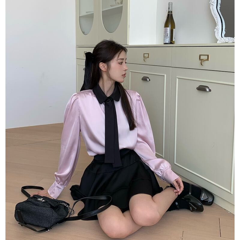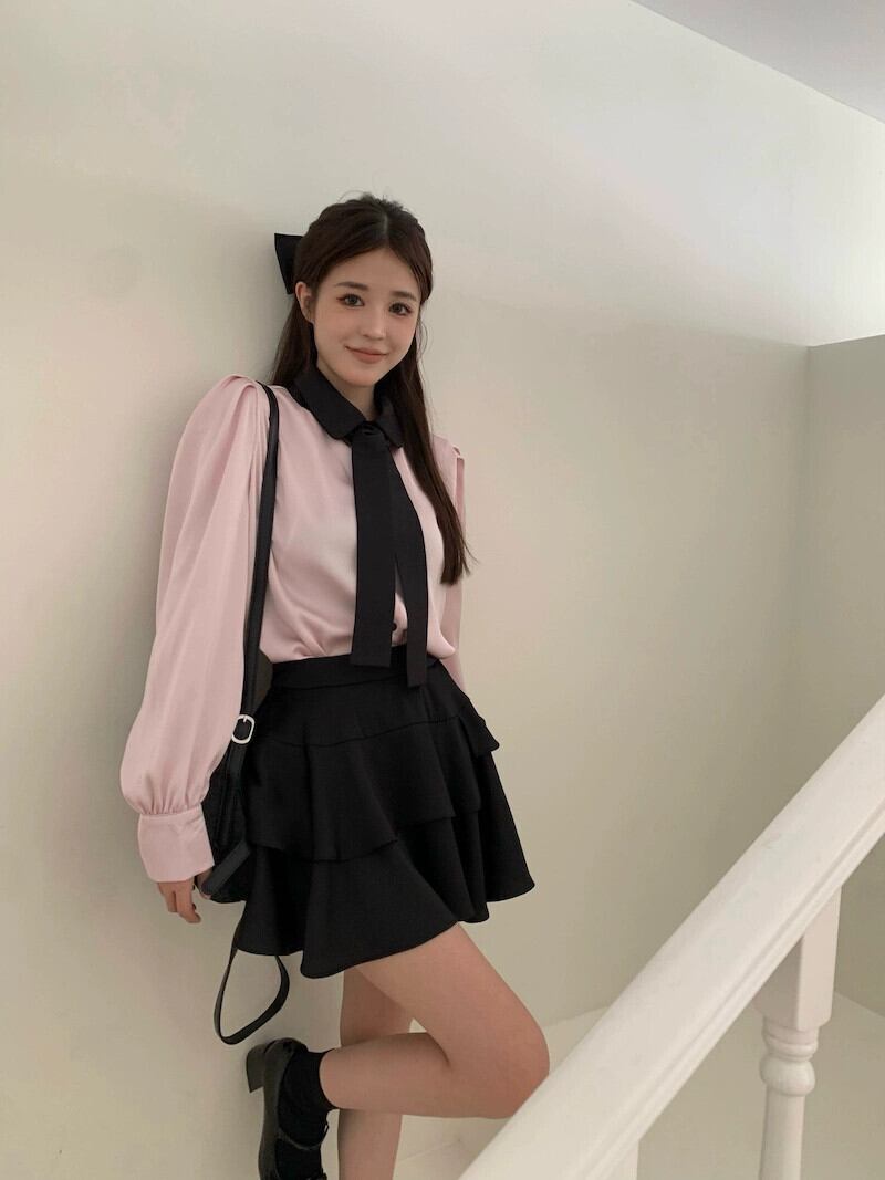 色:ピンクのシャツ,黒スカート