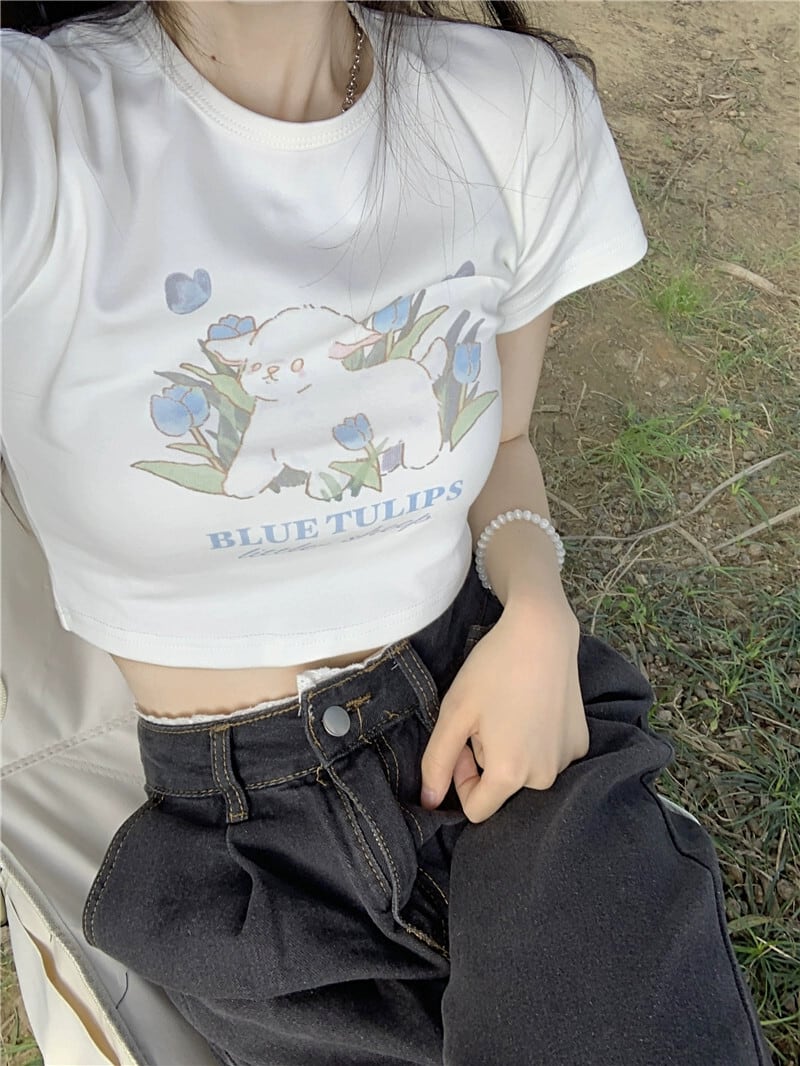 甘い年齢を軽減するショート T シャツの女性の夏のデザインセンスフロントショルダー漫画のプリントスリムフィット半袖ボトムトップスイン 大人ガーリー スウィート キュート カジュアル サマー 夏物 Tシャツ missk14154396649