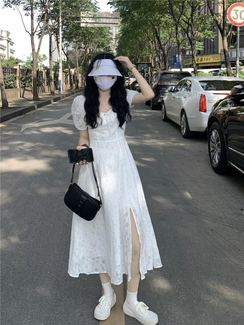 フランスの気質スリットドレス夏 2023 新しい eign スタイル初恋ハイウエストスクエアカラーパフスリーブミドル丈スカート女性 ハイウェスト サマー 夏物 スクウェア missk52430522265