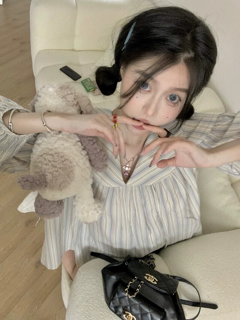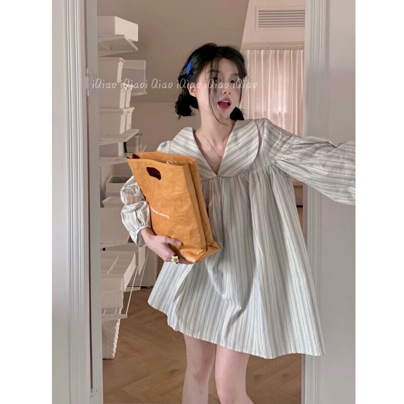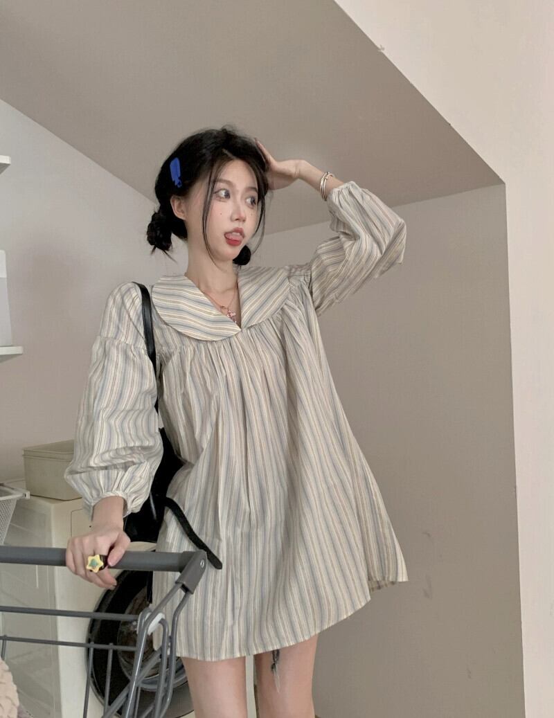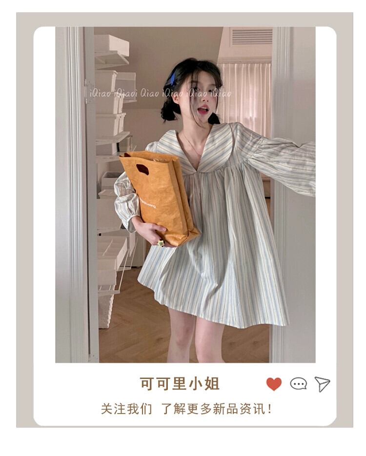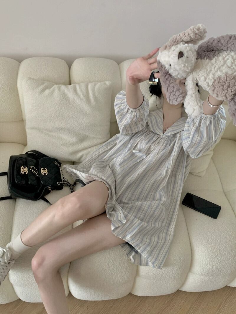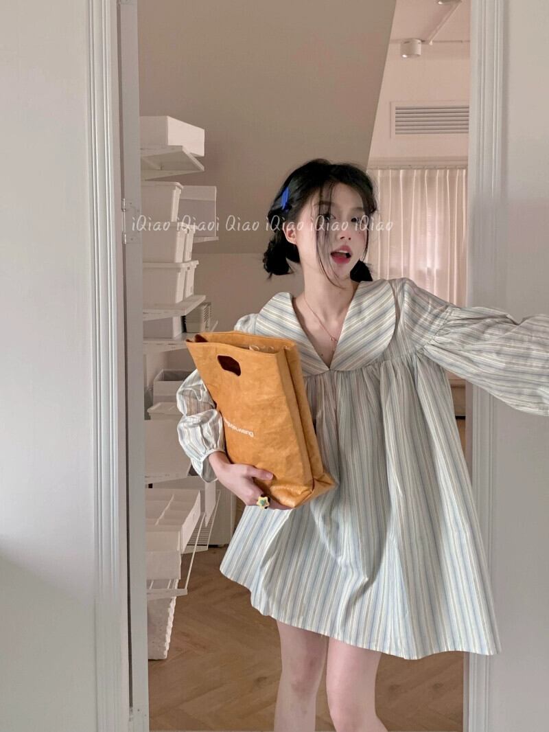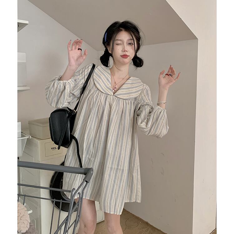 甘いストライプ長袖ドレス夏 2023 新しいファッション年齢を減らす人形の襟気質 A ラインスカート婦人服 ロング 大人ガーリー スウィート キュート カジュアル サマー 夏物 Aライン missk2431713975