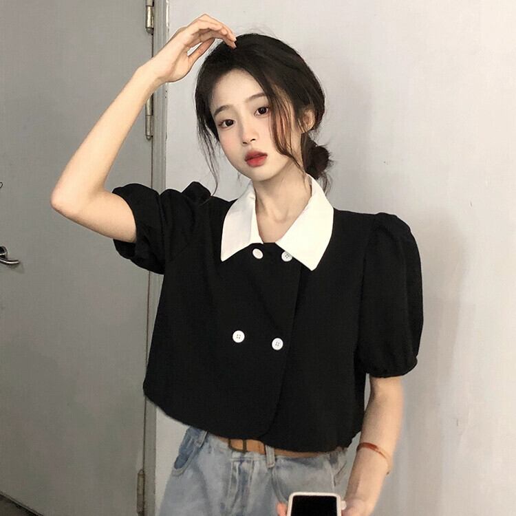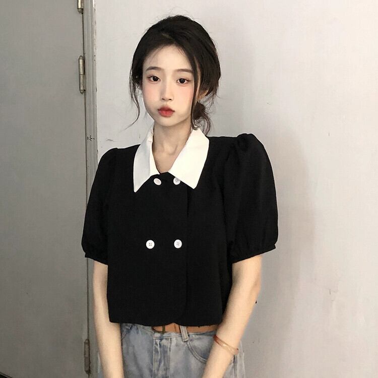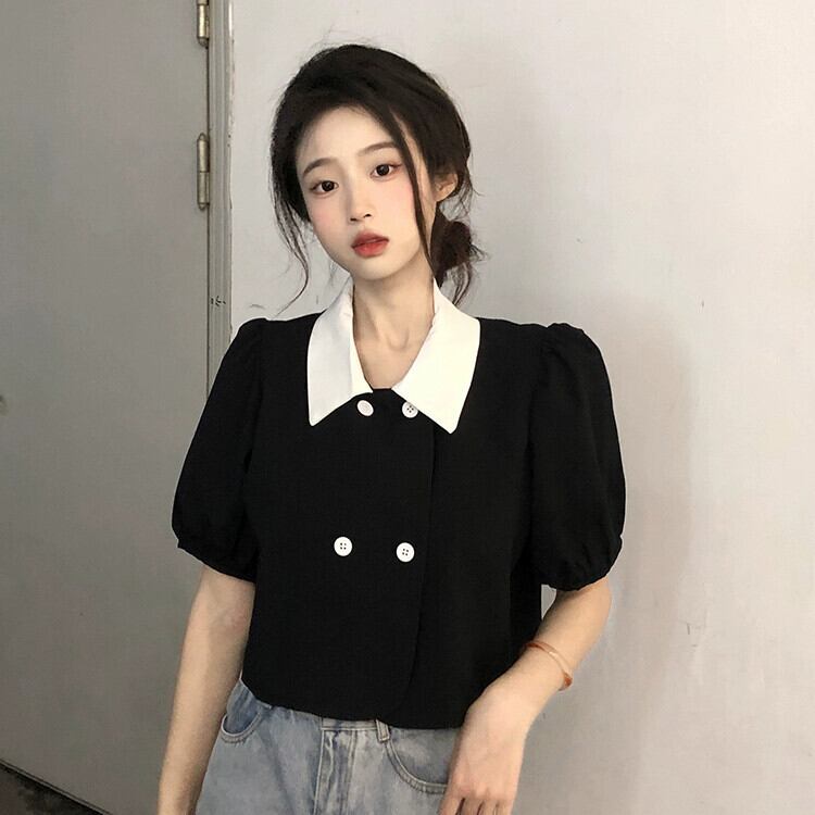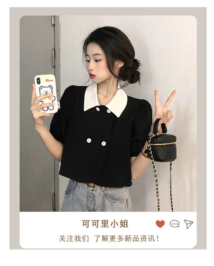 小さな香りのスタイルダブルブレスト半袖シャツ女性の 2023 夏の新しいデザインセンスカラーコントラストラペルアインスタイルカーディガントップ サマー 夏物 missk95785728895
