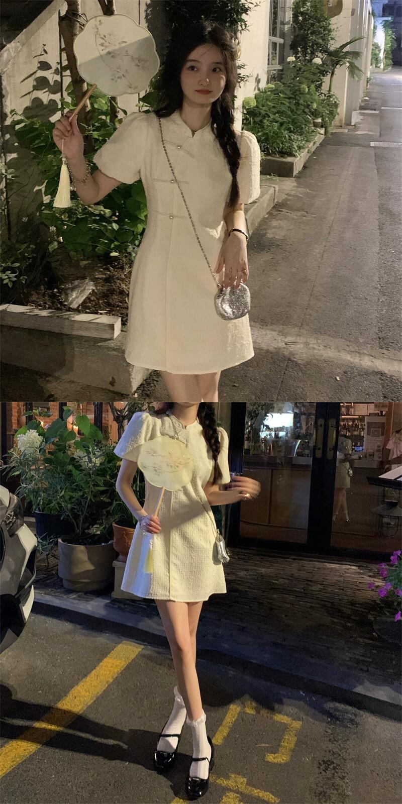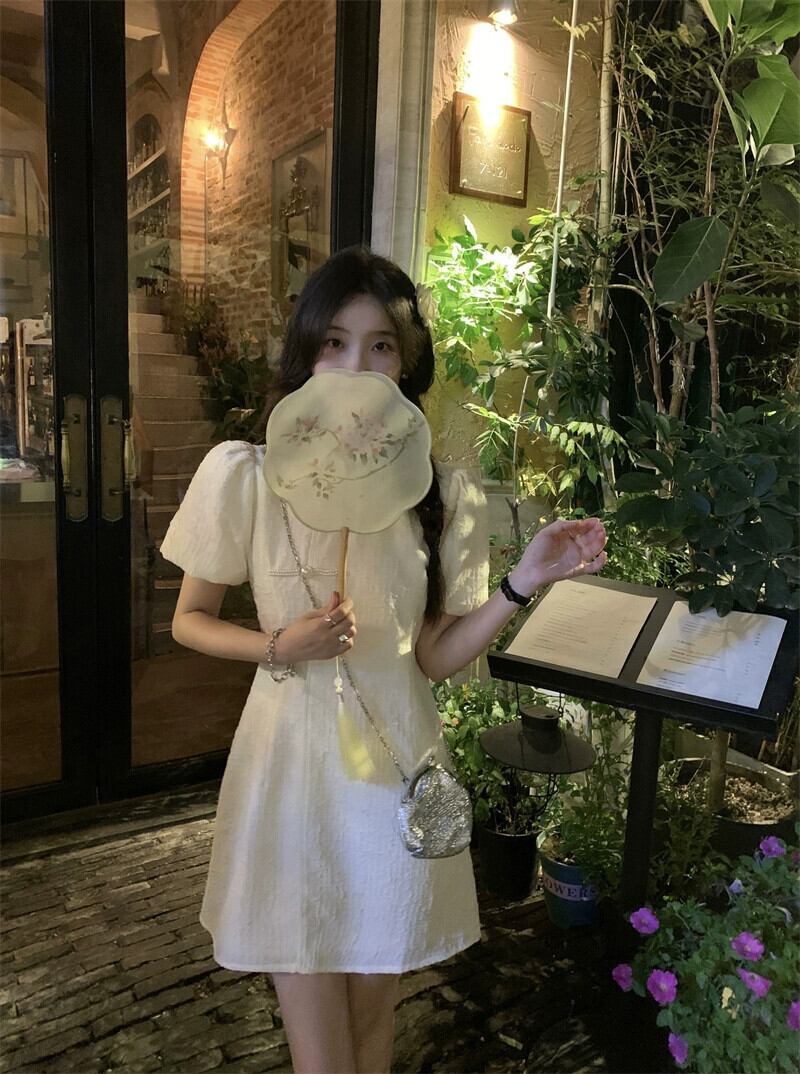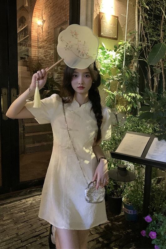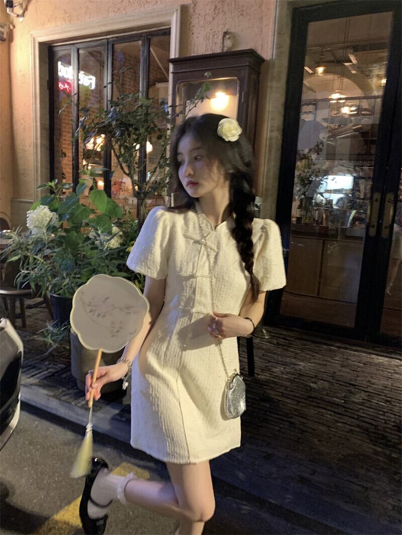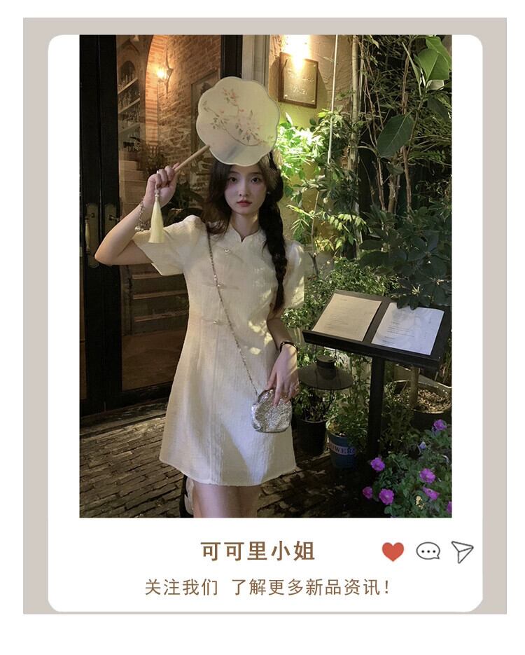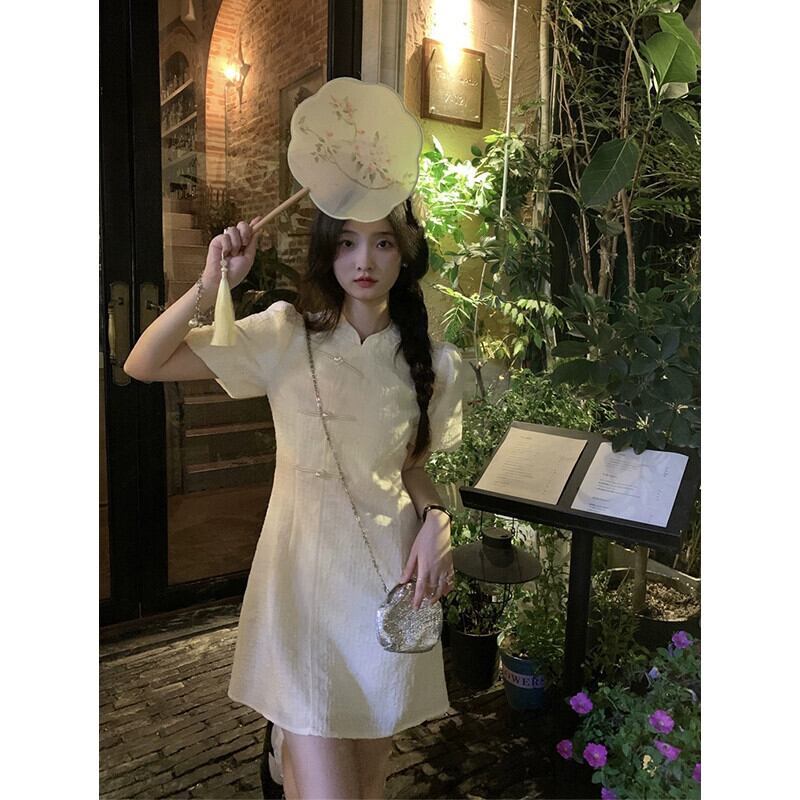 中国風チャイナドレススカート女性の2023年夏新デザインセンス痩身甘辛スタンドカラーパフスリーブドレス 大人ガーリー スウィート キュート カジュアル サマー 夏物 missk91966724853