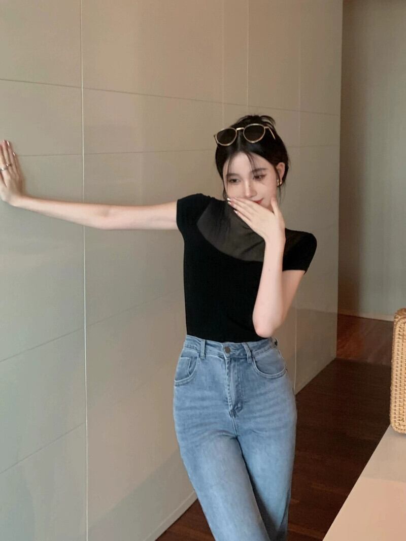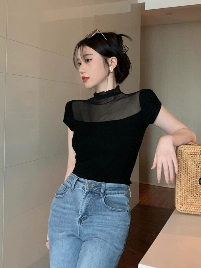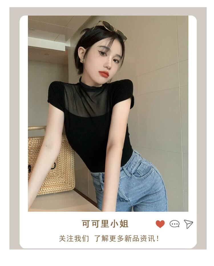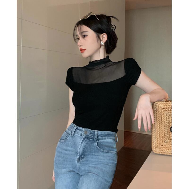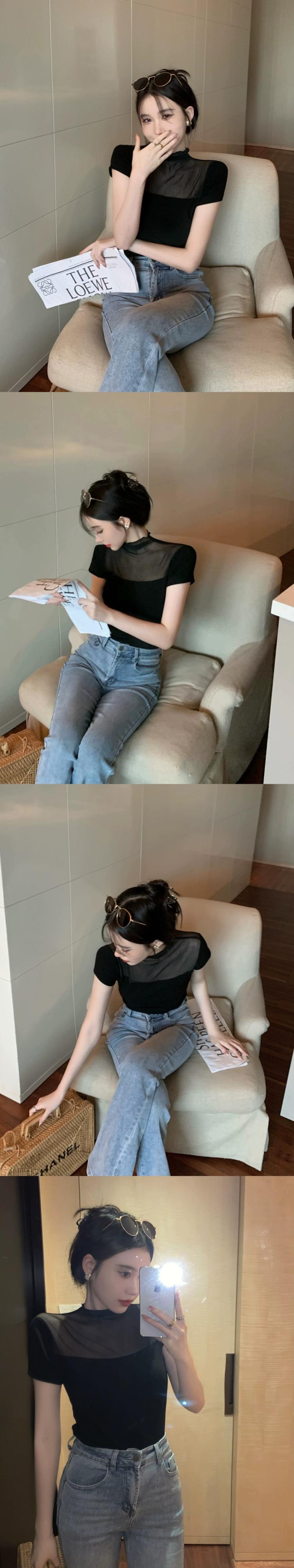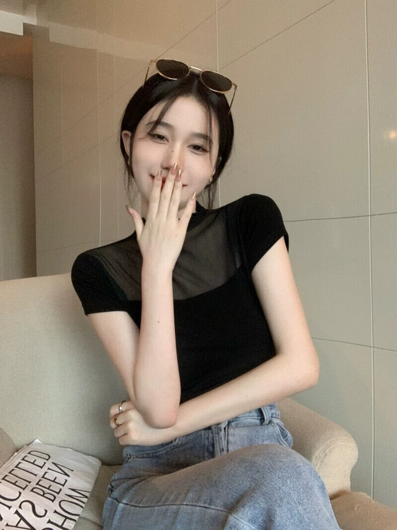黒メッシュマイクロ透明レースステッチ Tシャツ夏 2023 新しいスリムファッション半袖トップ婦人服 ブラック サマー 夏物 missk63167534652