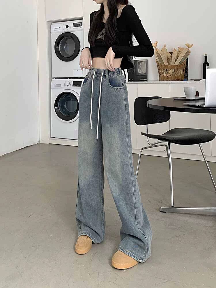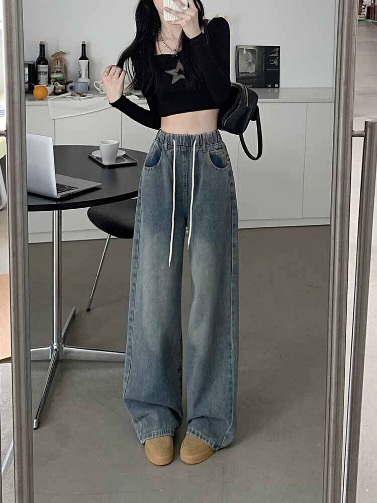 弾性巾着ルーズワイドレッグジーンズ女性の夏の 2023 新しい小さなレトロハイウエストスリムモップパンツ ハイウェスト エラスティック 伸縮 サマー 夏物 missk2048059518