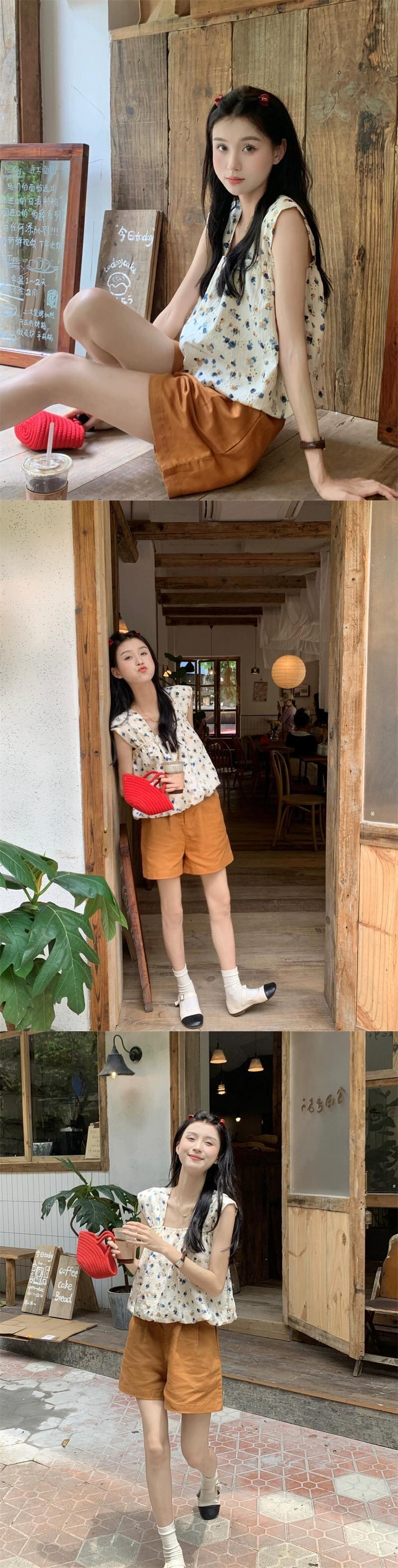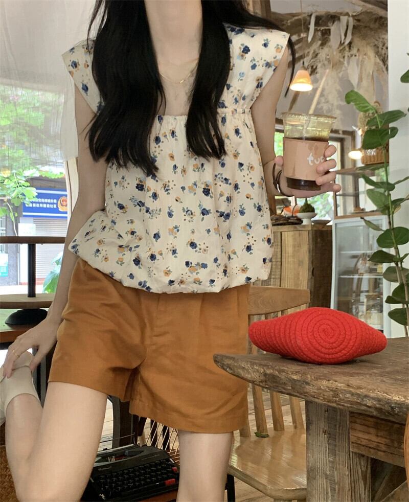 色:オレンジのショートパンツ,フローラルトップ