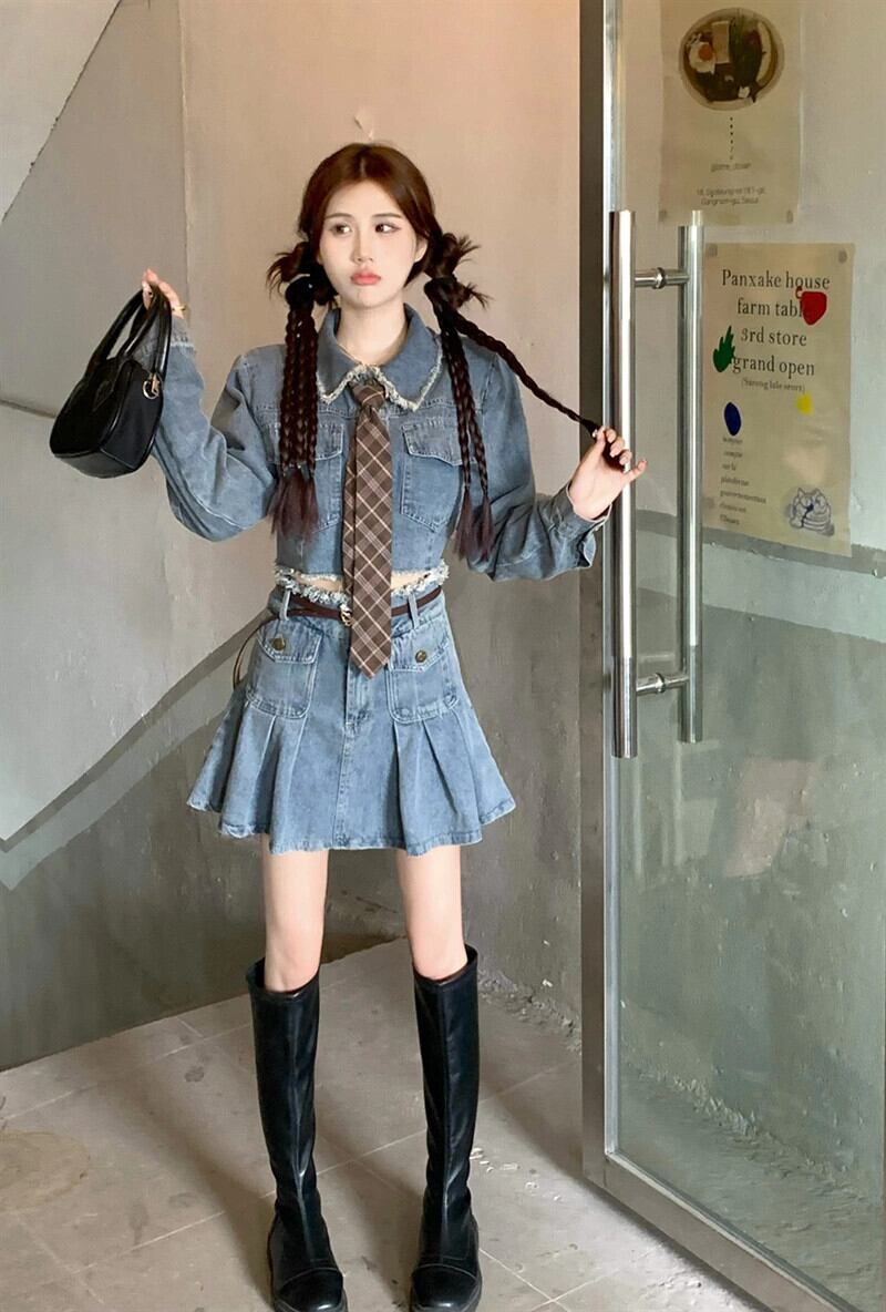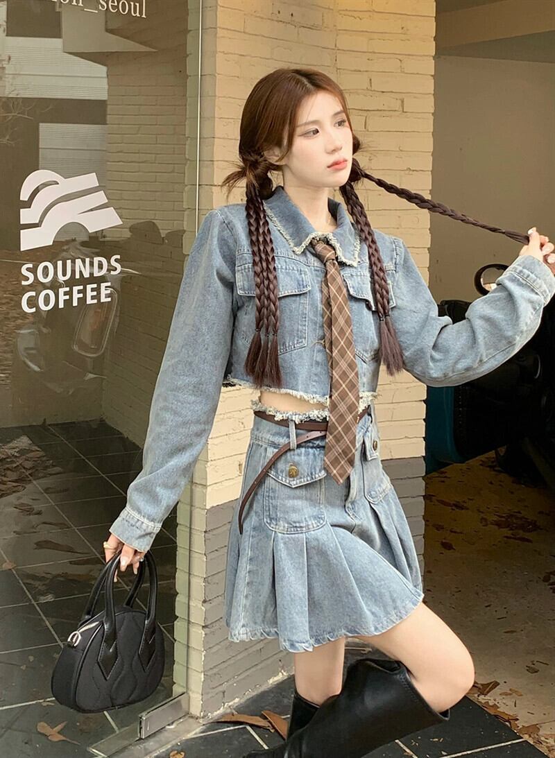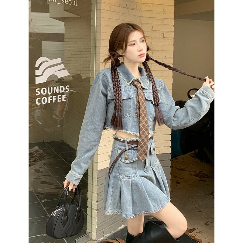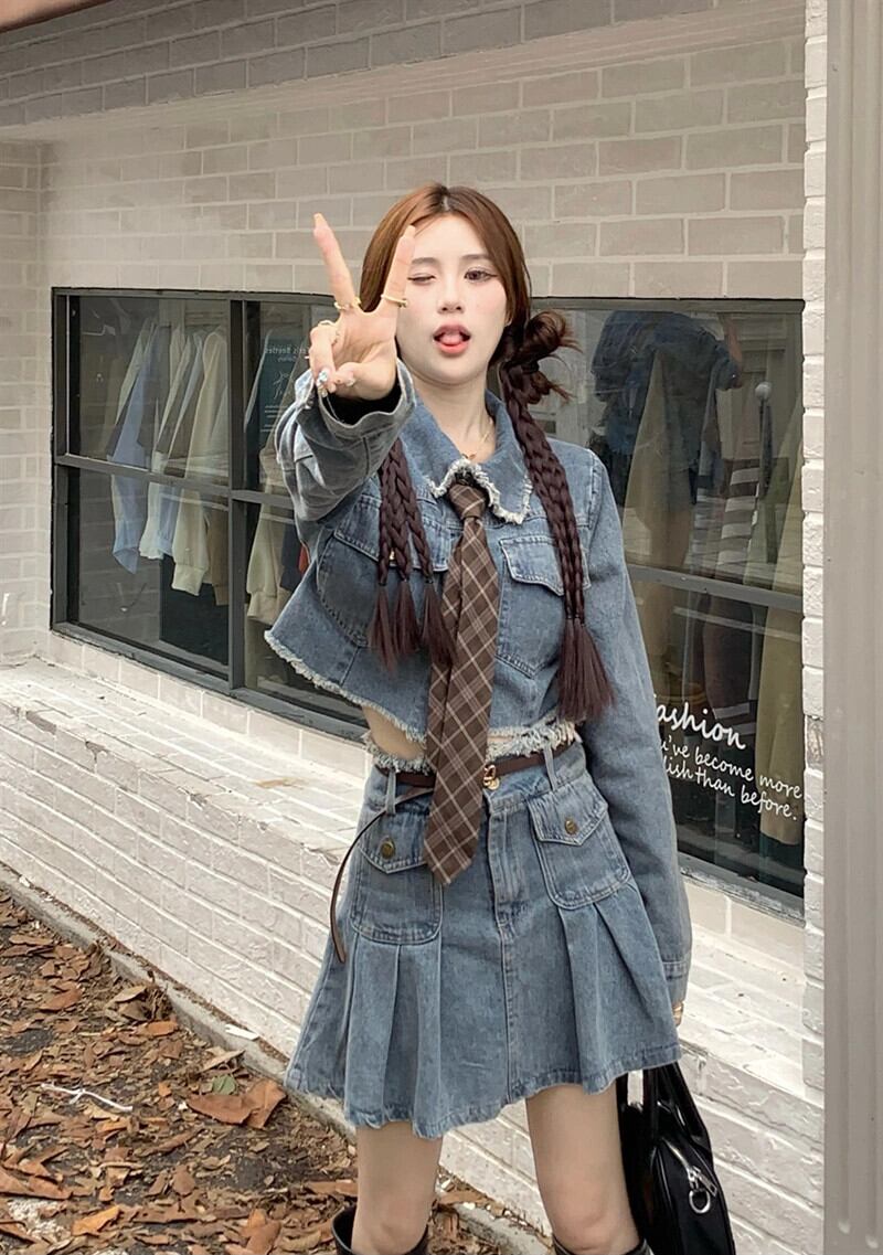 甘いクール生エッジショートデニムジャケットハイウエストプリーツスカート女性の夏の 2023 新しいファッションスーツ ハイウェスト 大人ガーリー スウィート キュート カジュアル サマー 夏物 missk11130073141