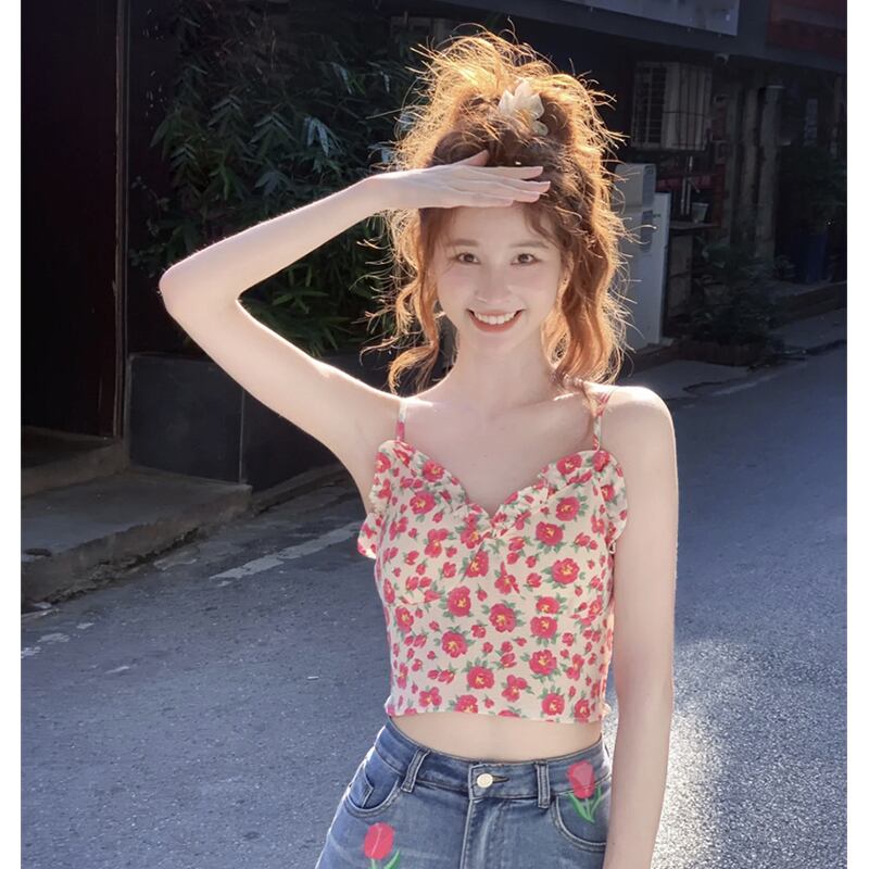 甘い純粋な欲望風花アウターサスペンダー夏 2023 新しいファッションスリムショートノースリーブベストトップ女性 半袖 ハーフスリーブ 大人ガーリー スウィート キュート カジュアル サマー 夏物 花柄 ピュア missk45996473125