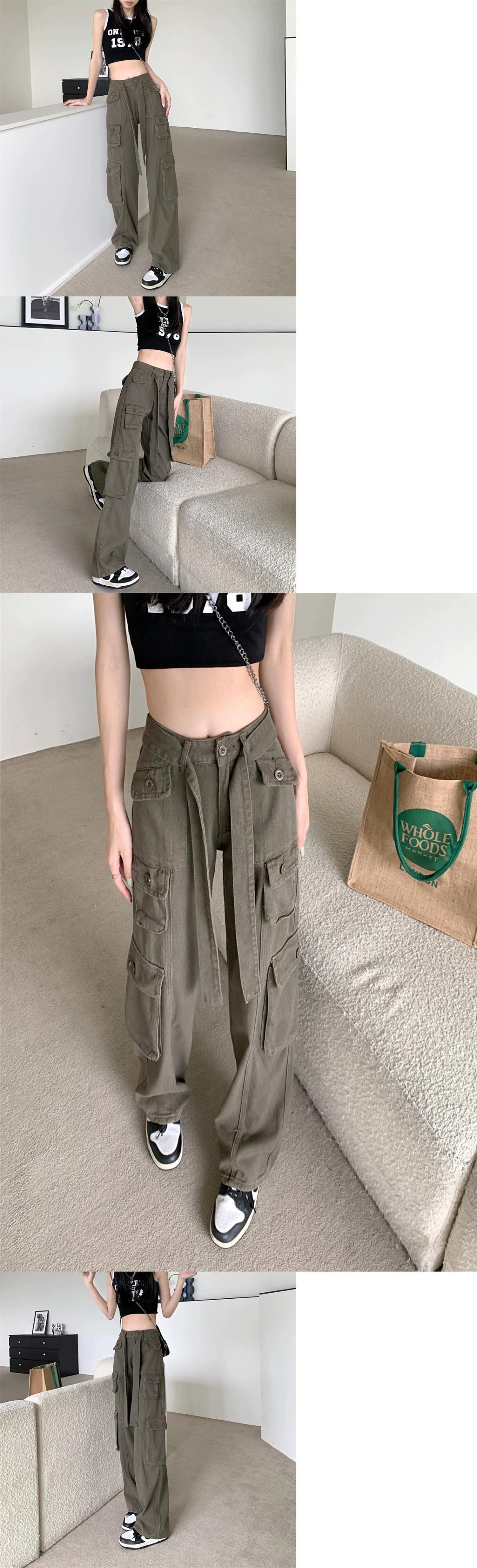 ポケットワークパンツ夏 2023 新しいハイウエストスリムストレートワイドレッグパンツカジュアルモップパンツ女性 ins ハイウェスト サマー 夏物 ワイドパンツ missk13282563195