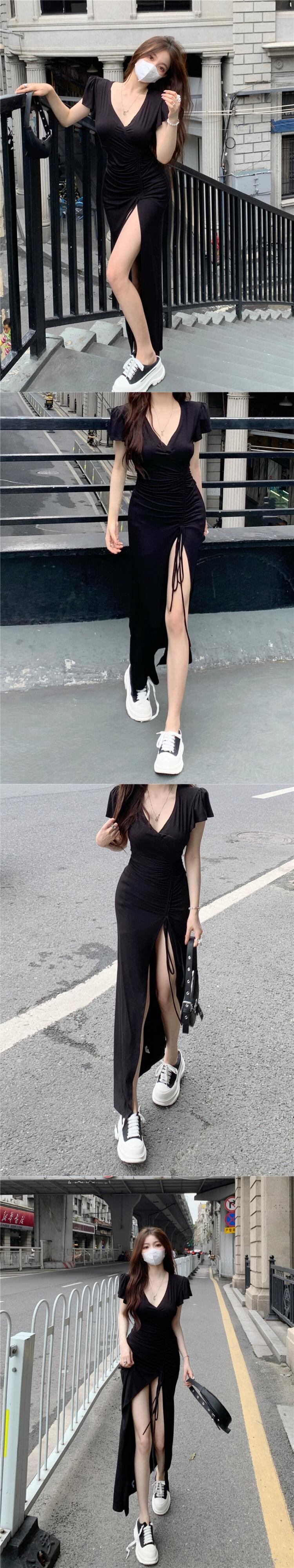 Vネックプリーツスリットドレスレディース2023夏新作ロイヤルシスタースタイルウエスト痩身半袖ロングスカート サマー 夏物 missk9677824391