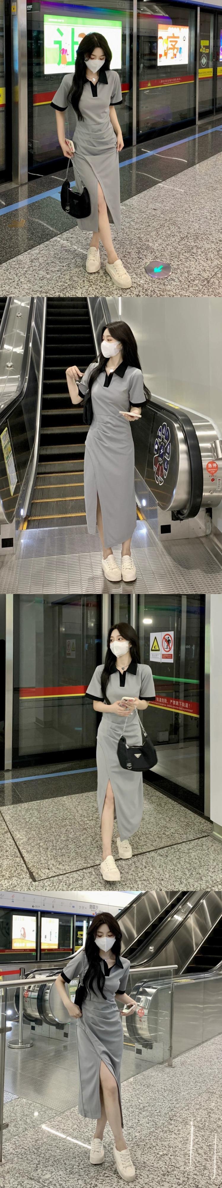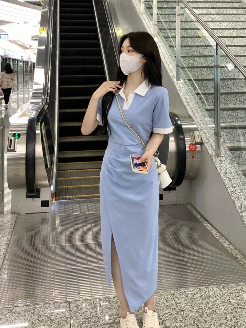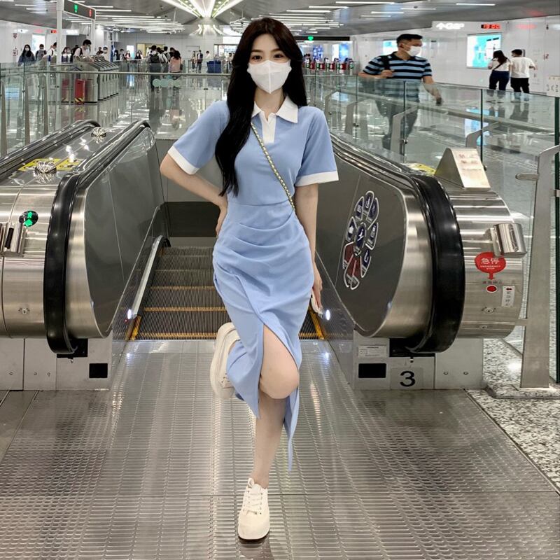 ポロカラードレスレディース2023夏新デザイン折り目スリットスリムスリム気質半袖ロングスカート サマー 夏物 missk36159921144