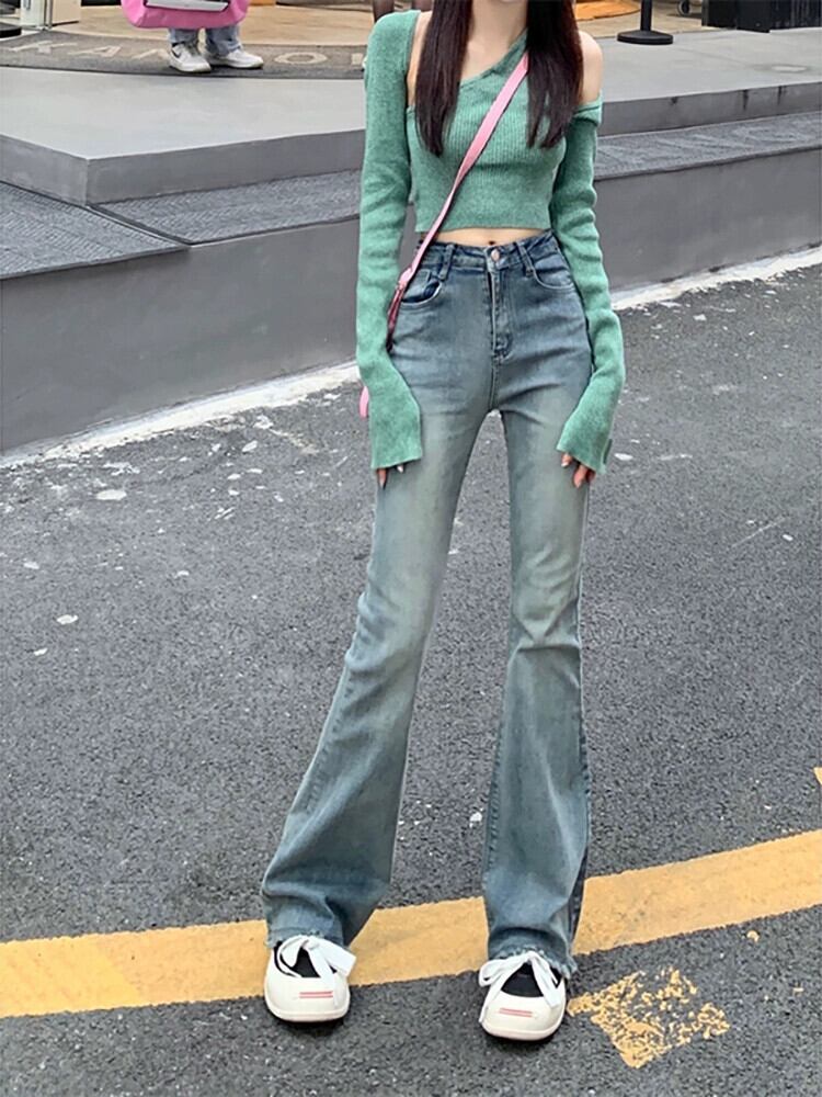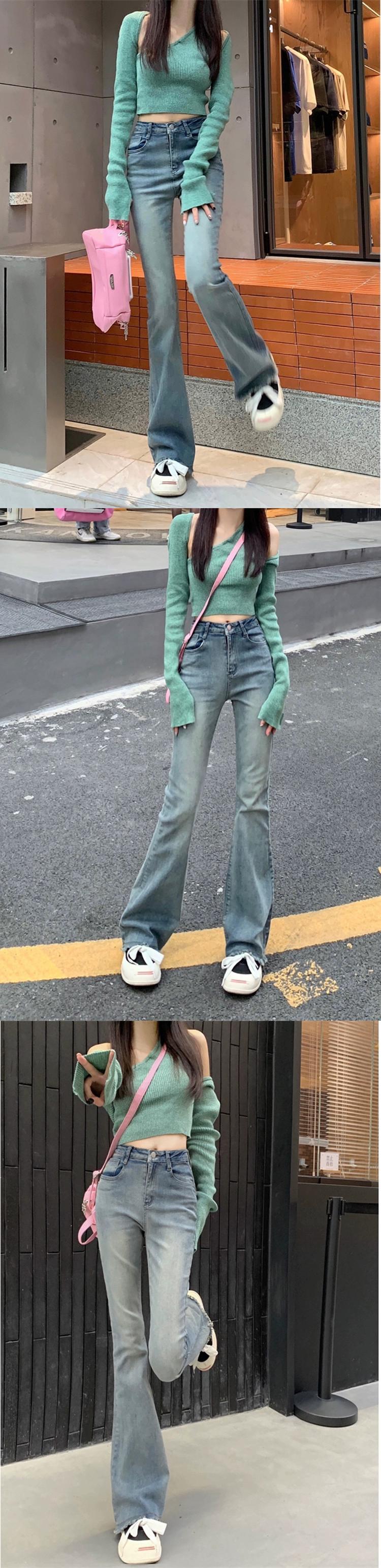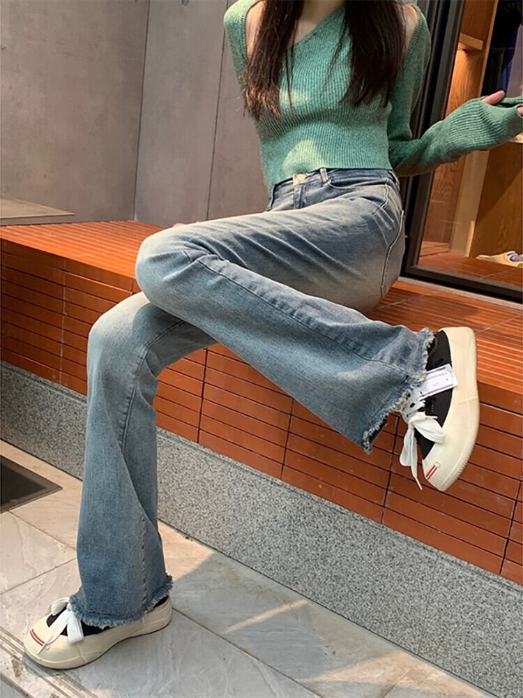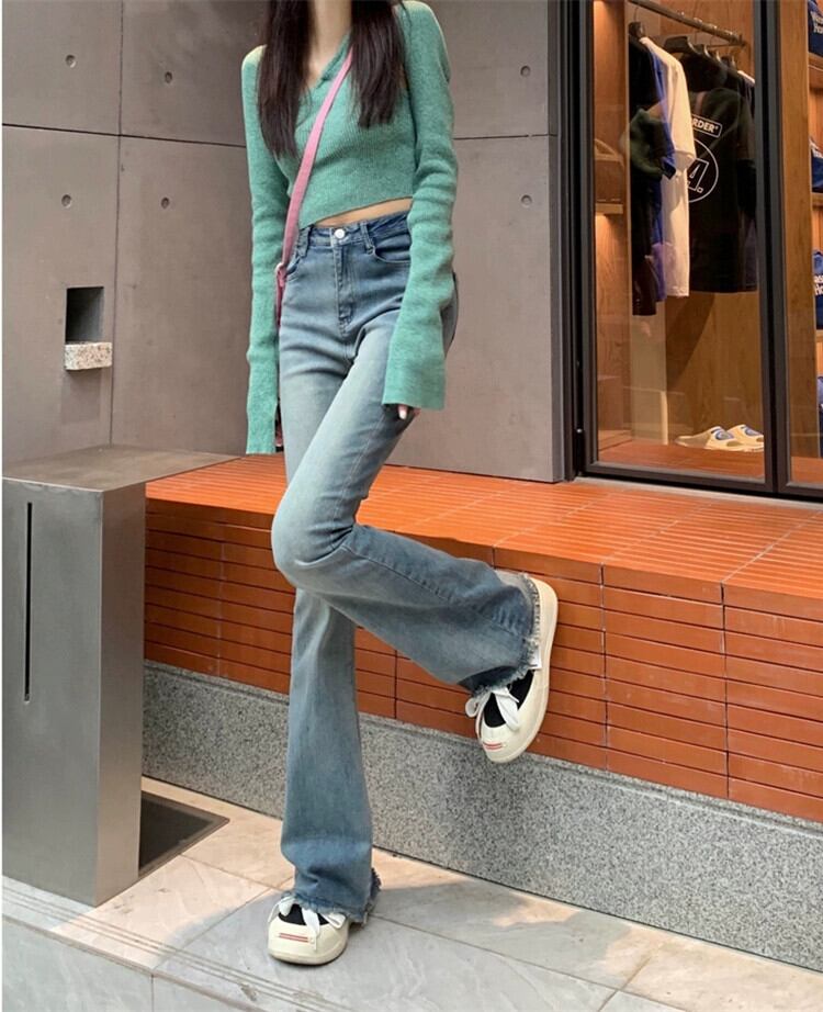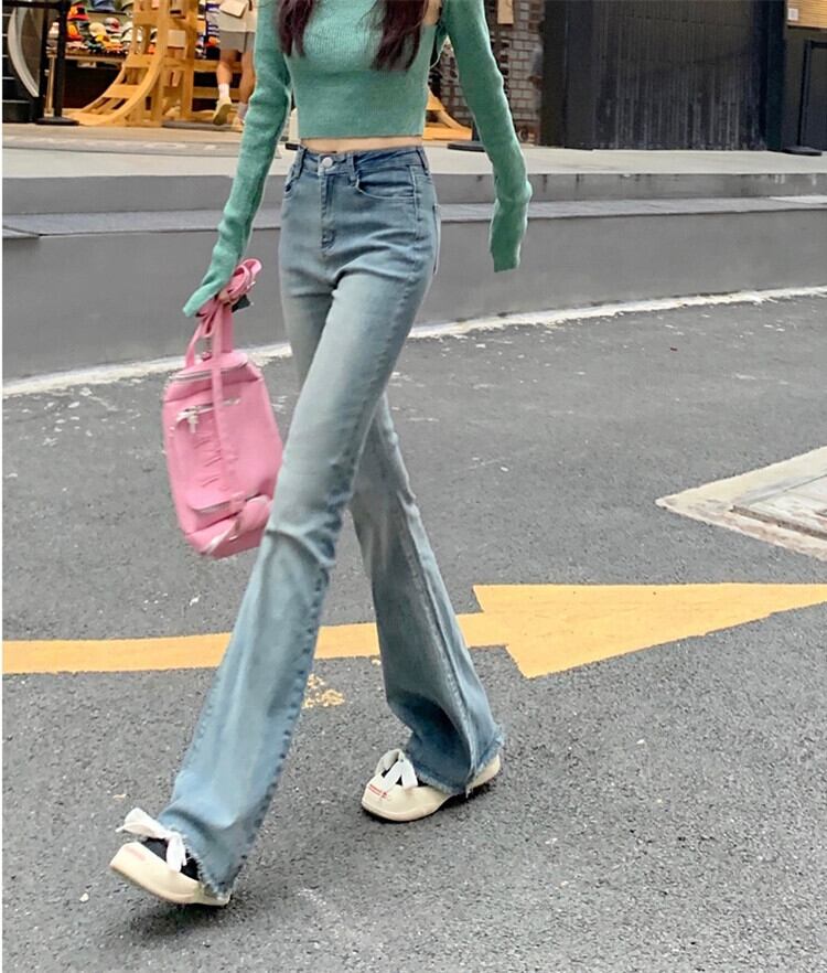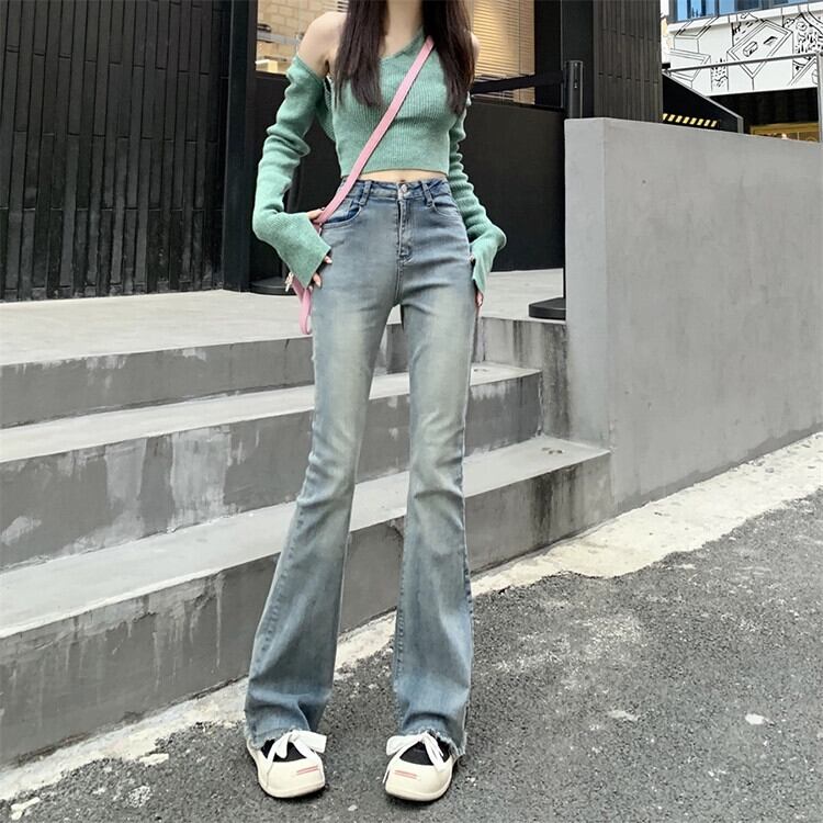 レトロブルーウエストジーンズ女性の夏 2023 弾性スリムスリムホットガールローエッジマイクロレースパンツ エラスティック 伸縮 サマー 夏物 missk33220814943