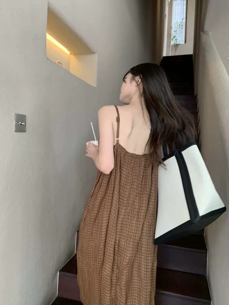 フレンチ怠惰なスタイルのシックなスリングドレス夏 2023 新しい気質チェック柄デザイン感覚ルーズロングスカート女性 サマー 夏物 missk60787187766