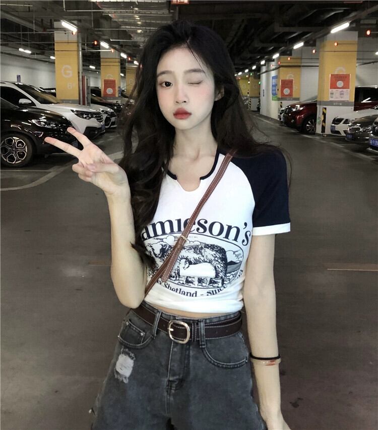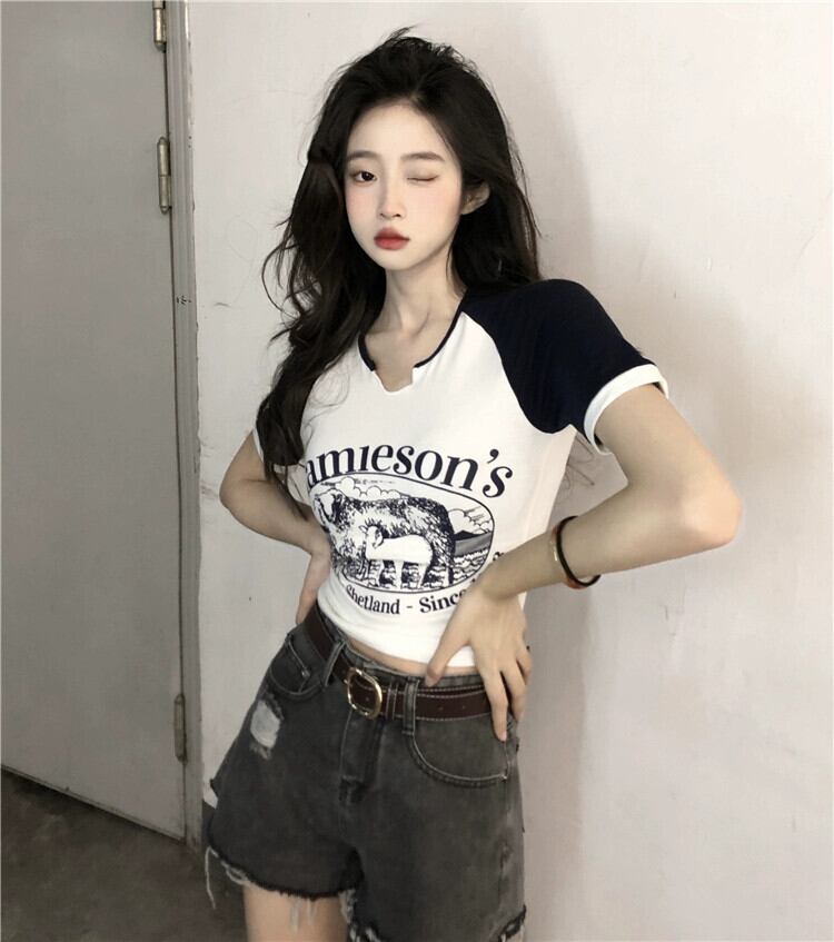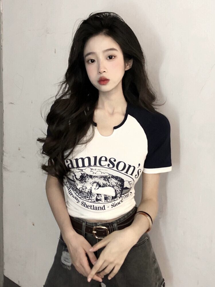 Sweet Spice Girls フロントショルダーショート Tシャツ 夏 2023 コットン コントラストカラー V ネック スリムフィット BM 半袖トップ レディース 大人ガーリー スウィート キュート カジュアル サマー 夏物 Vネック missk40384071945