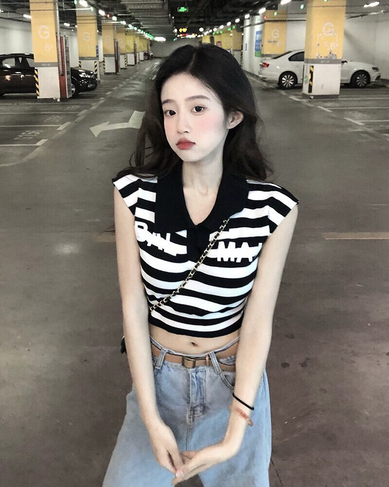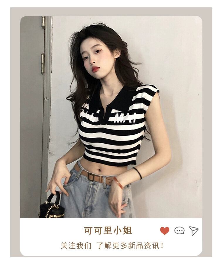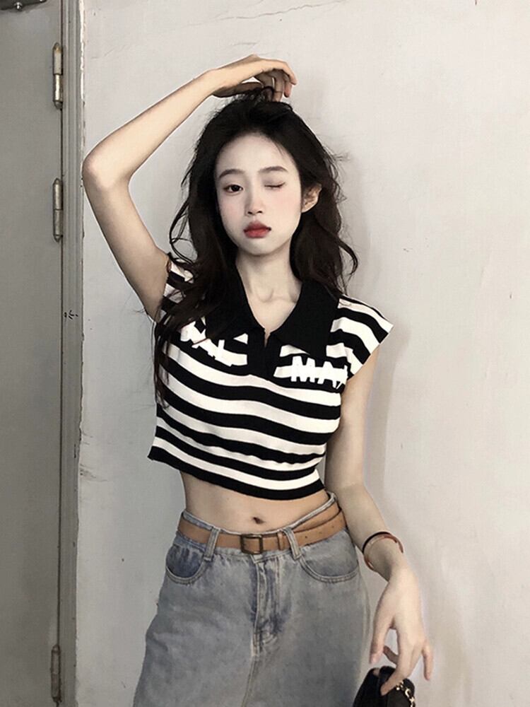 ポロ襟ショートへそストライプ Tシャツ夏 2023 新しいシックなファッションニット半袖アッパー女性潮 サマー 夏物 missk94585895416