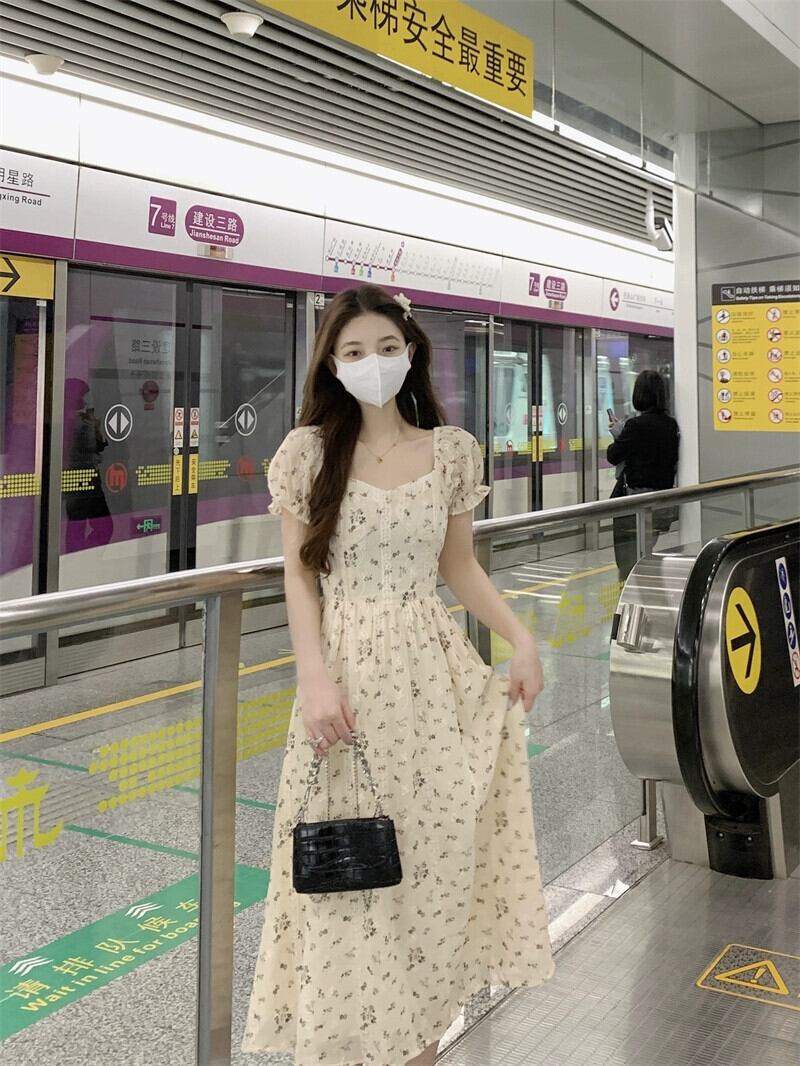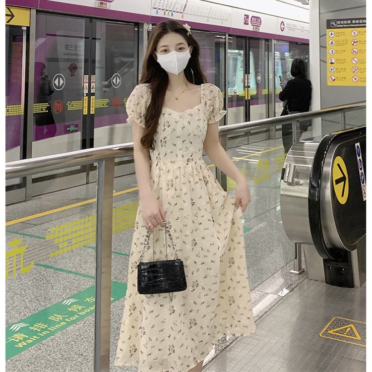 フレンチスタイルの優しい風パフスリーブドレス夏2023新しい気質スクエアカラーハイウエストスリム花柄スカート女性の潮 ハイウェスト サマー 夏物 スクウェア missk63676421293