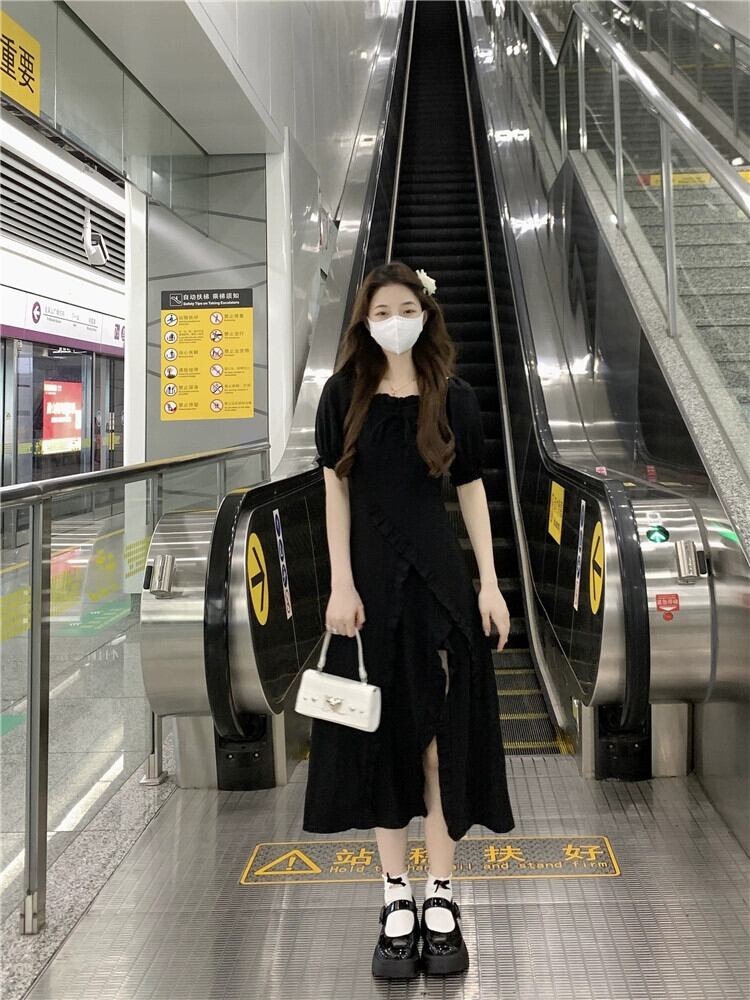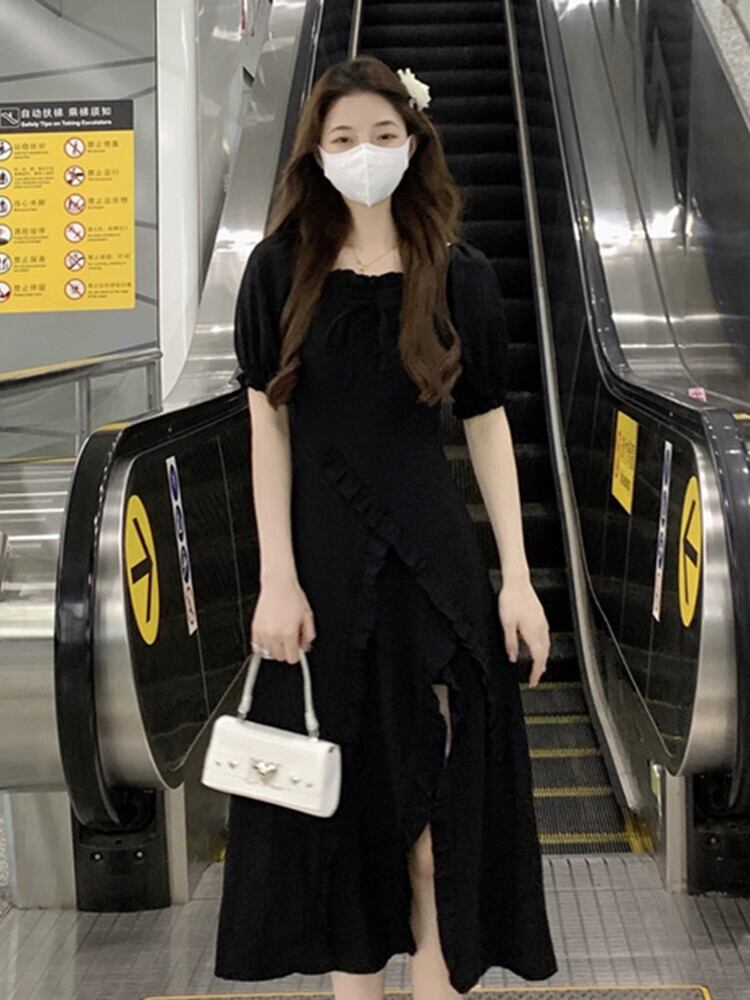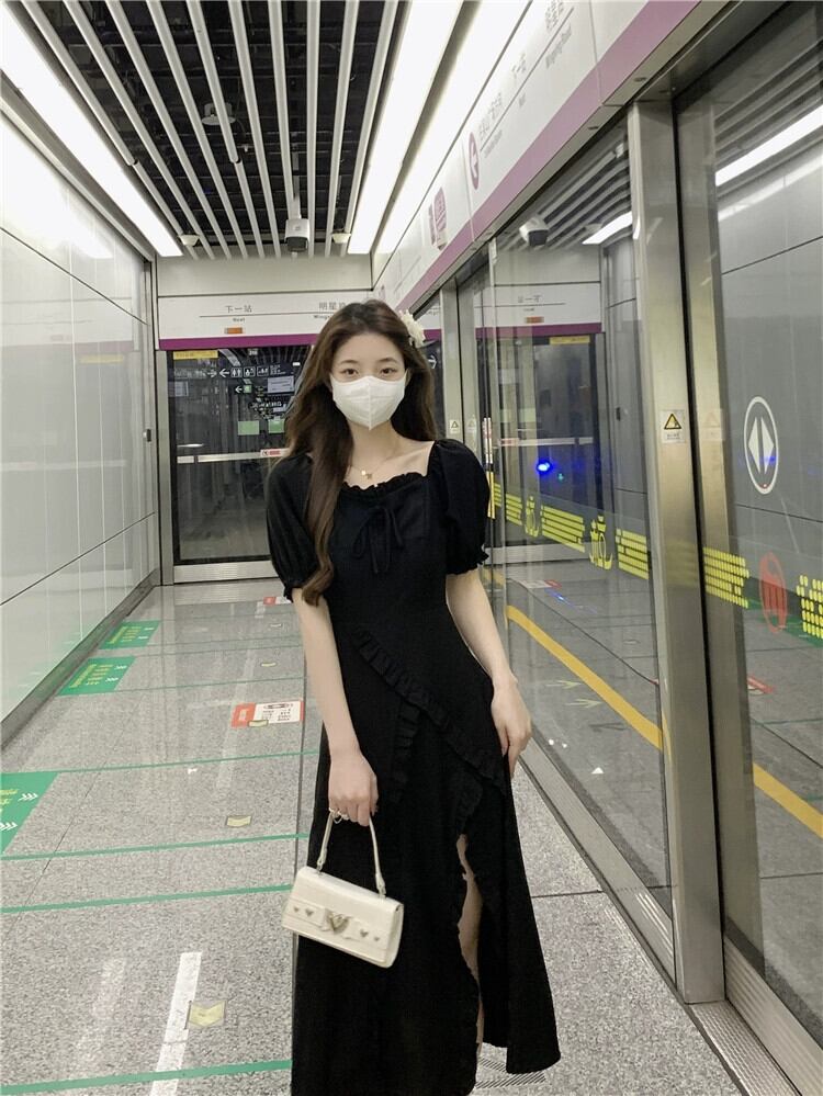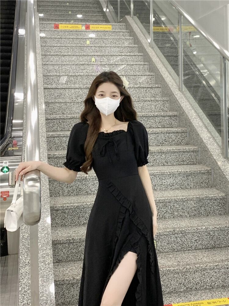 フレンチネクタイ不規則なスクエアカラードレス夏 2023 新しいウエスト痩身スリット A ラインロングスカート婦人服 サマー 夏物 Aライン スクウェア missk16055915981