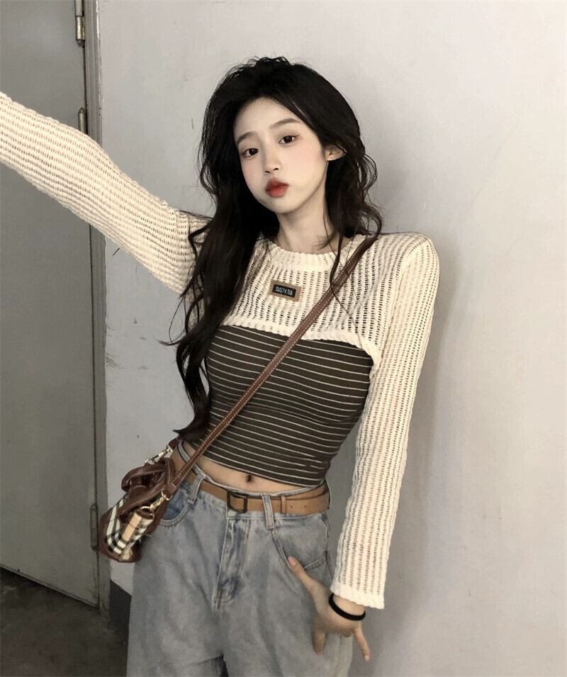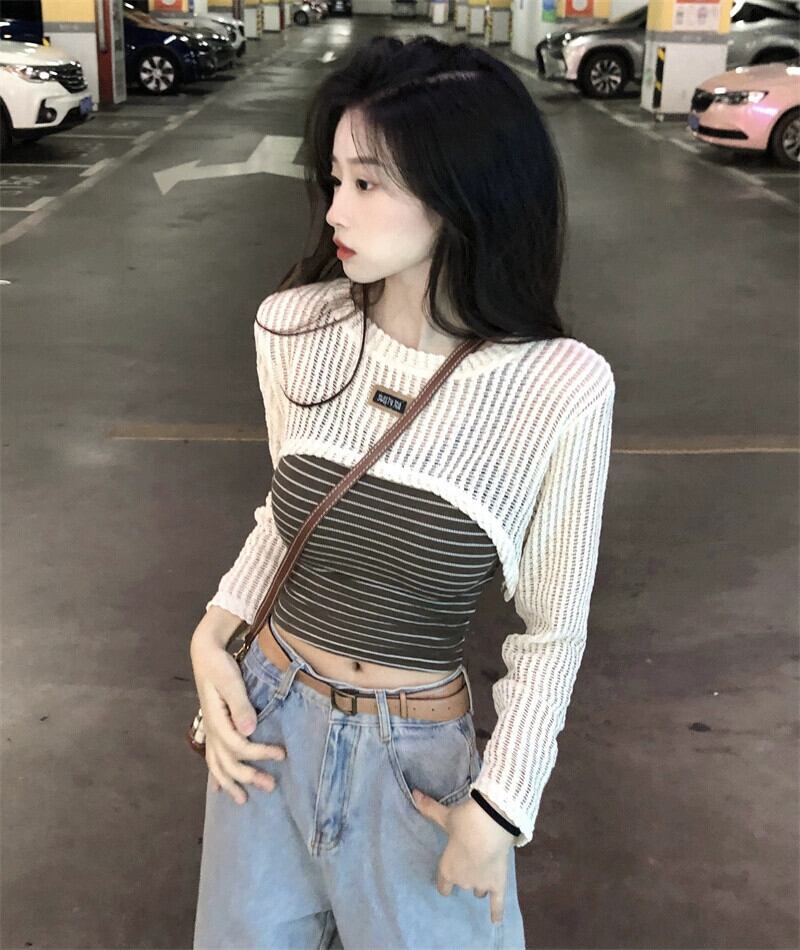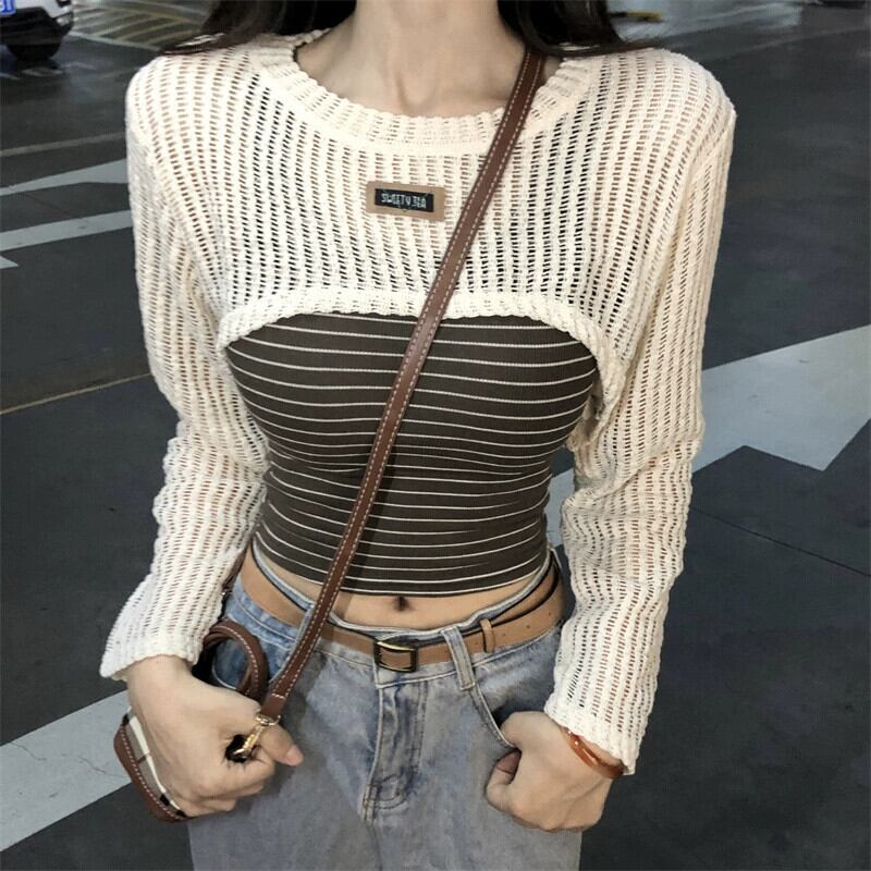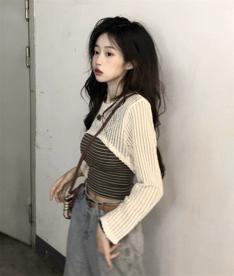 センス中空長袖ショートニットブラウスファッションスーツ夏の新しいスリムストライプベスト女性 ロング サマー 夏物 missk86708207343