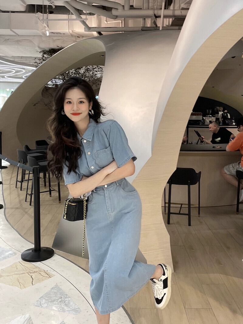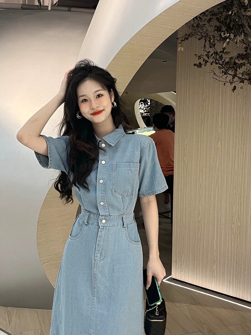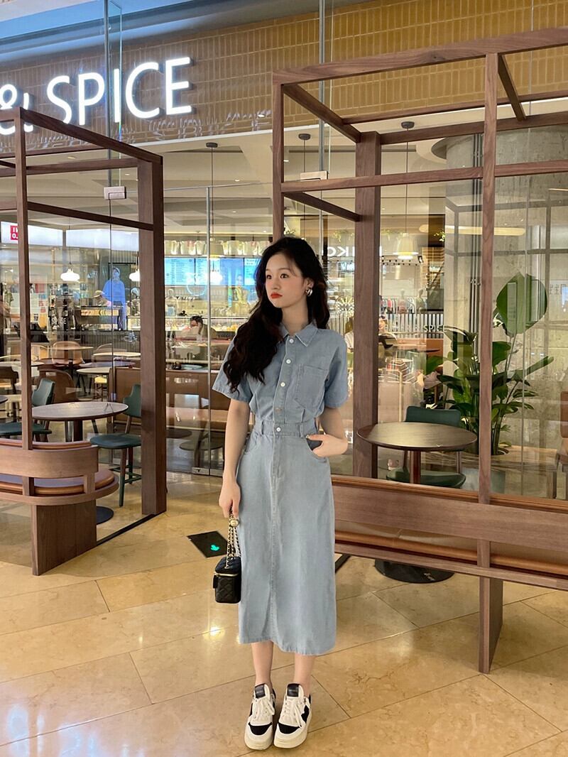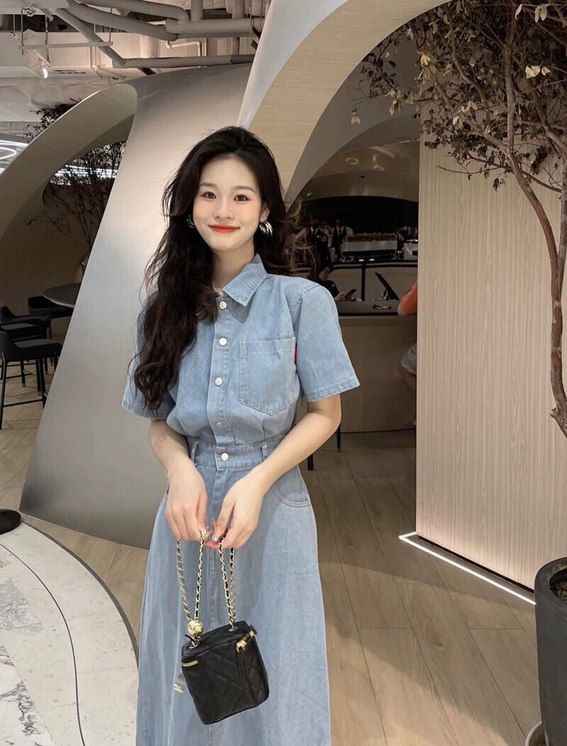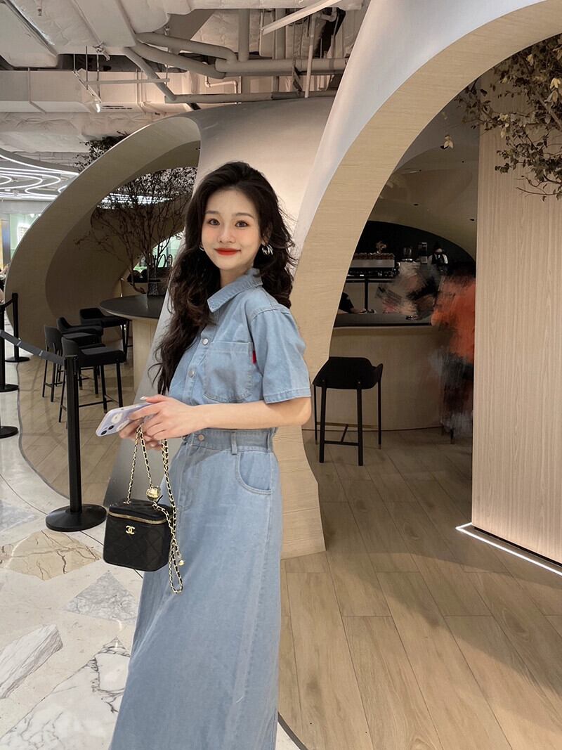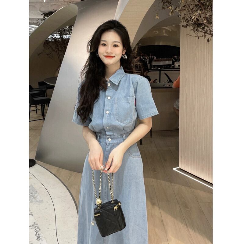 シックなデニムポロカラードレス夏 2023 新しいハイウエストファッションデザインミッドレングススカートトレンディな女性 ハイウェスト サマー 夏物 missk75316871279