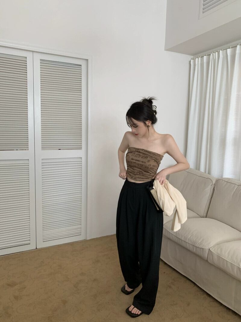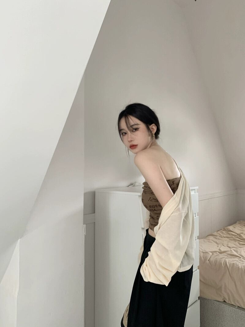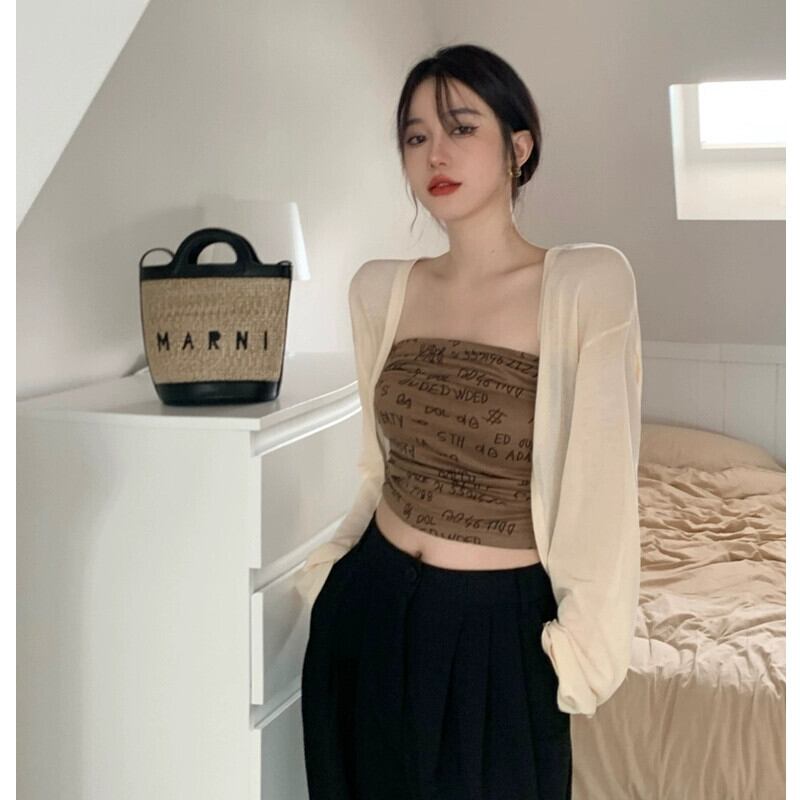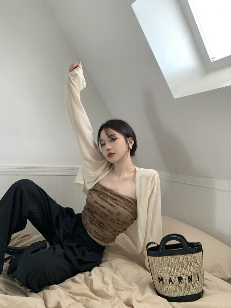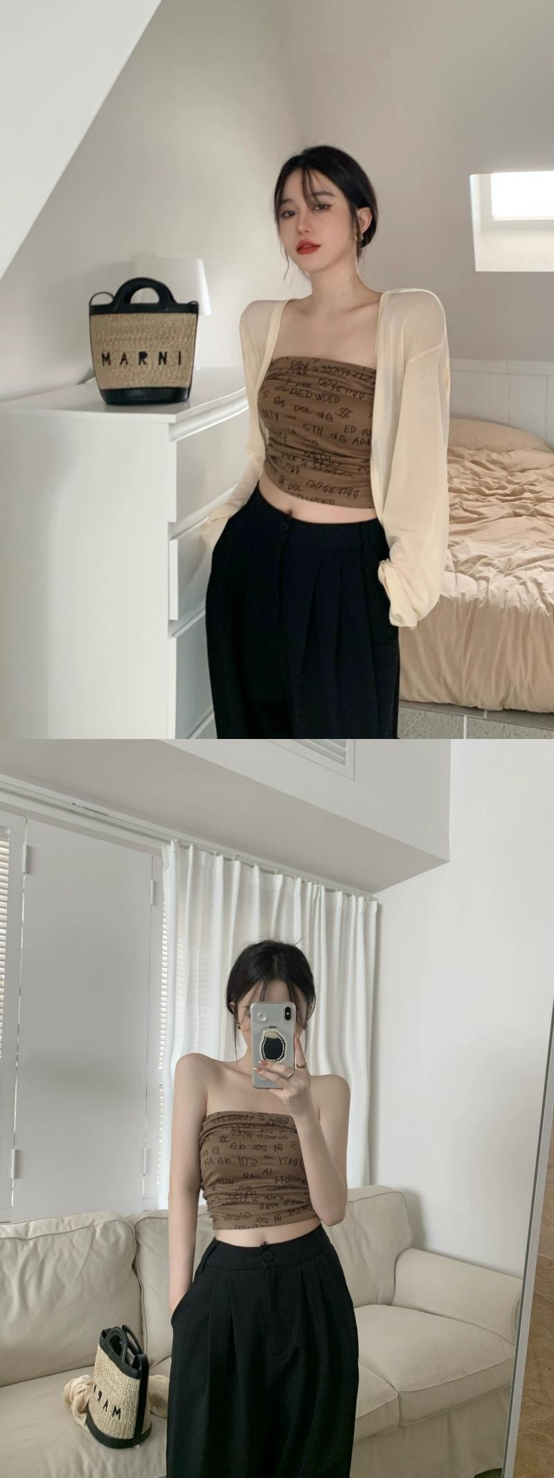 色:ベージュカーディガン,コーヒーカラーのチューブトップ