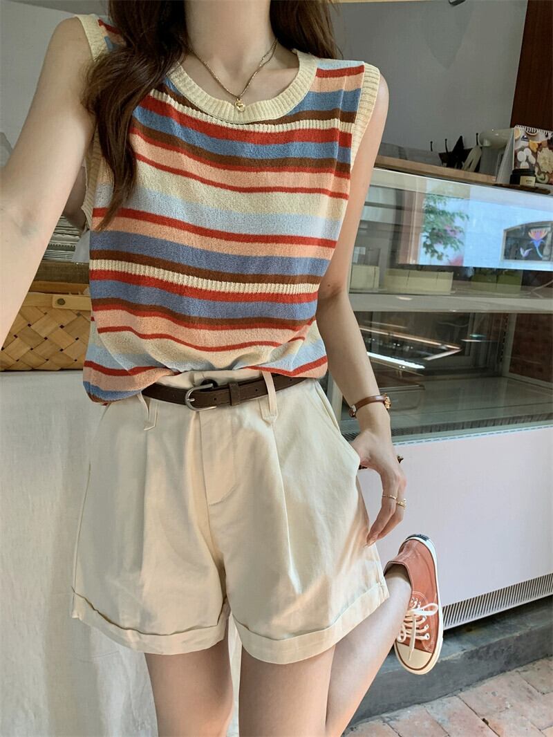 レトロカラーノースリーブストライプベストサスペンダーウエストワイドレッグショーツ夏2点セット サマー 夏物 ブルマー ワイドパンツ missk37076936153