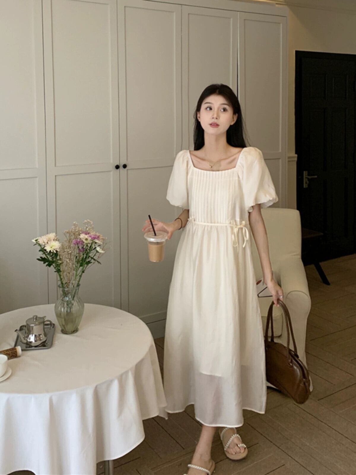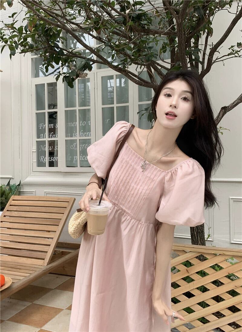 スクエアカラー パフスリーブ ワンピース レディース 夏新作 フレンチ シャーリング タイ ウエスト ミモレ丈 ピンク スカート シック サマー 夏物 スクウェア missk77860772484