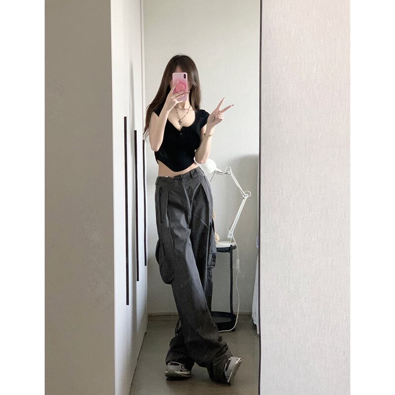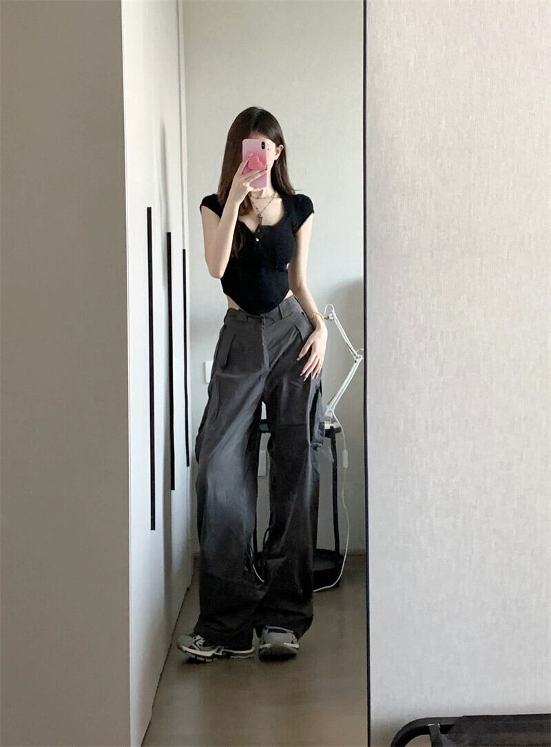 Uネック半袖Tシャツトップハイウエストグレーレトロ古い作業服カジュアルパンツ女性夏新作2点セット ハイウェスト サマー 夏物 missk53834096703