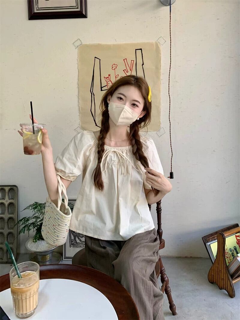パフスリーブシャツスクエアカラーネクタイデザインセンスニッチ2023夏新作甘いルーズショート半袖トップ 大人ガーリー スウィート キュート カジュアル サマー 夏物 スクウェア missk68364518140