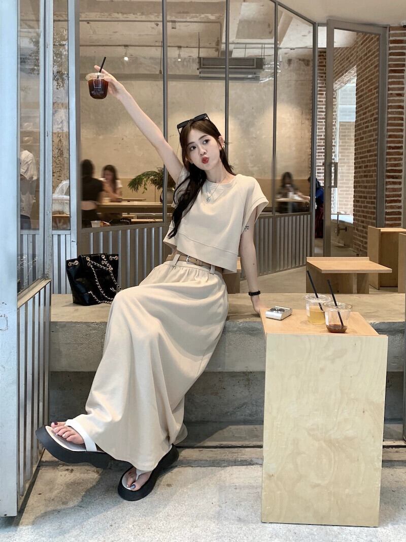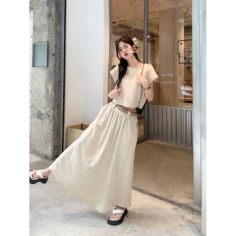 甘辛ラウンドネックショート半袖Tシャツトップスハイウエストスカートロングスカートレディース夏新作塩2点セット ハイウェスト 大人ガーリー スウィート キュート カジュアル サマー 夏物 Oネック missk44203748827