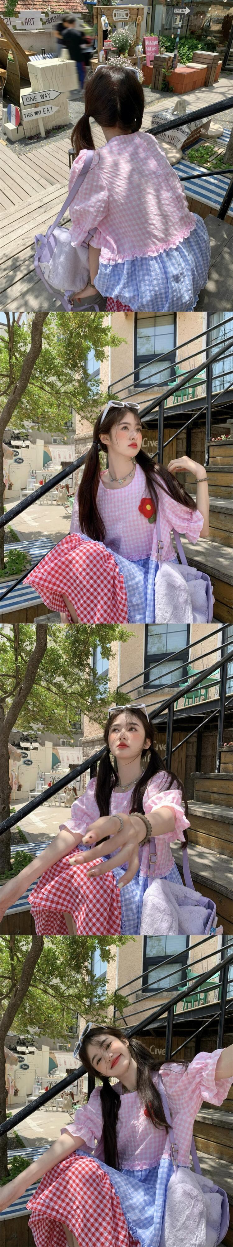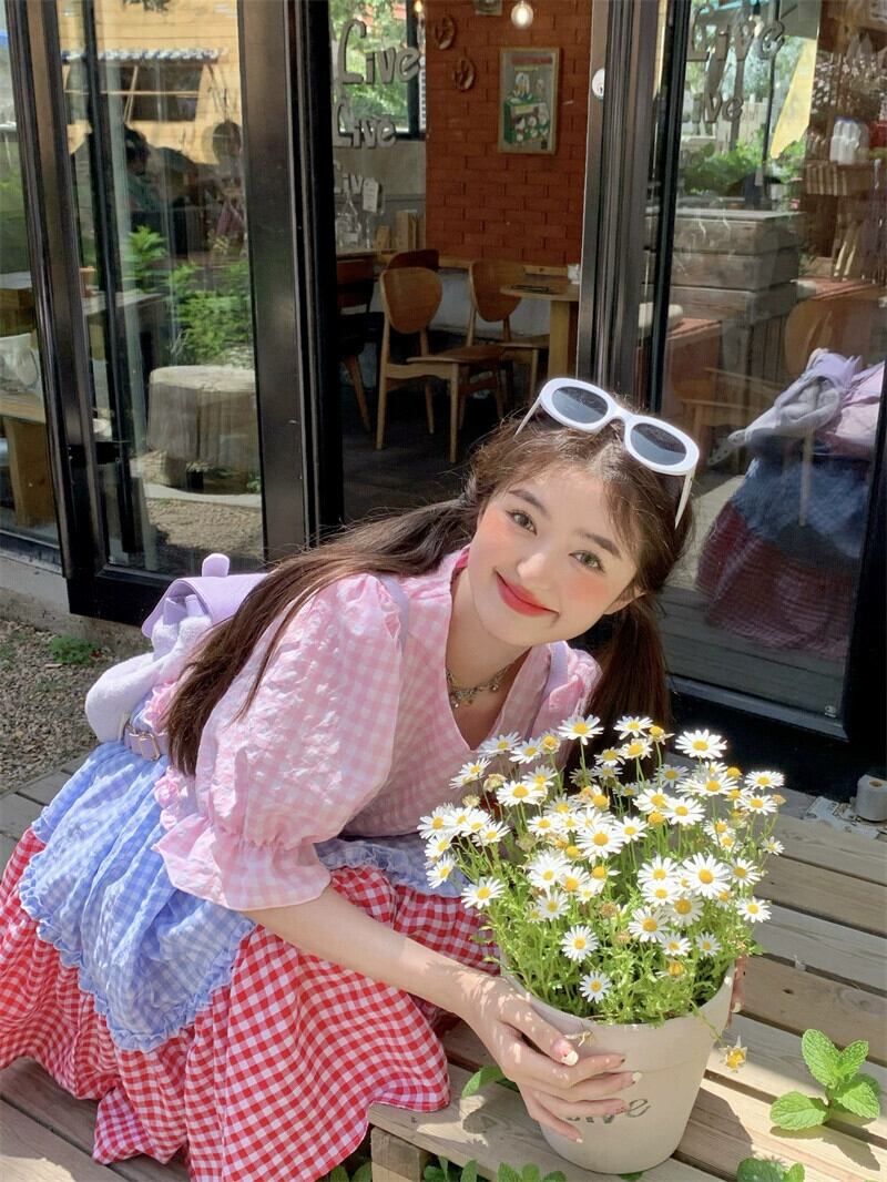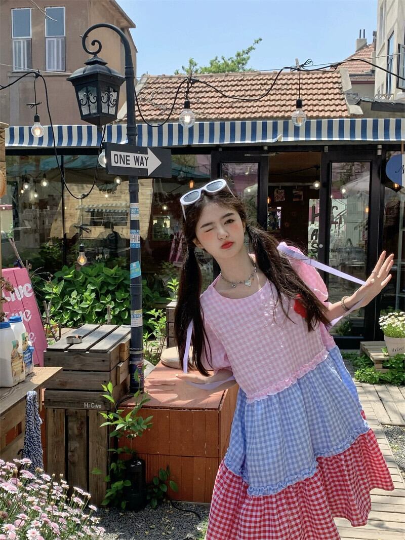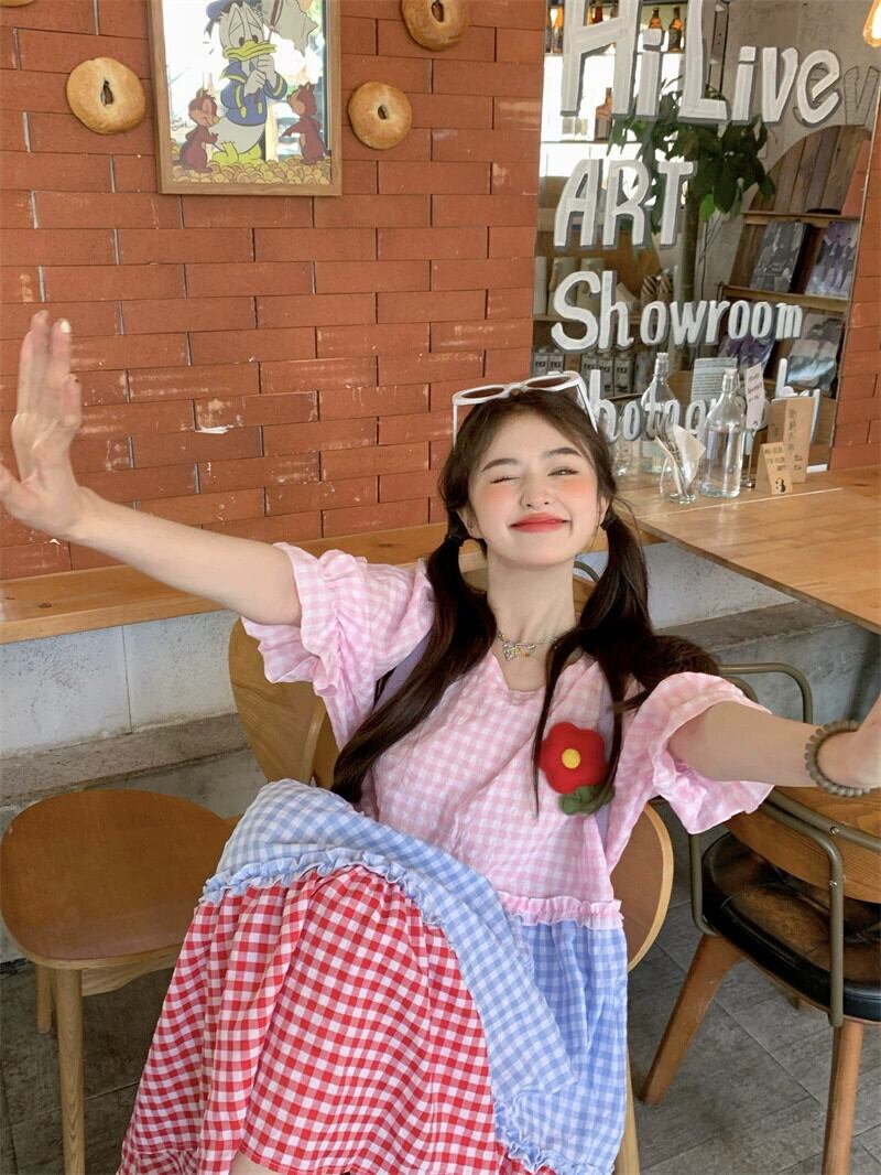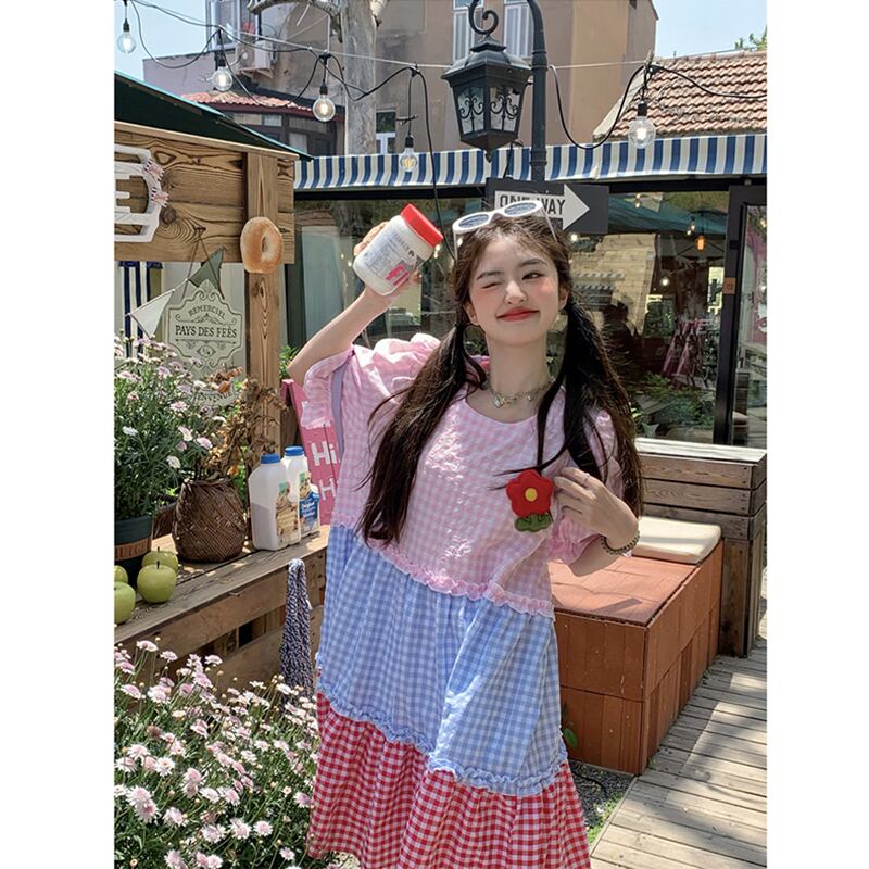 甘い年齢を減らすカラーマッチングドレス夏の新しいスタイルの立体花と菌の耳ルーズラウンドネックミドル丈スカートの女性 大人ガーリー スウィート キュート カジュアル サマー 夏物 Oネック フラワーデザイン missk31039090583