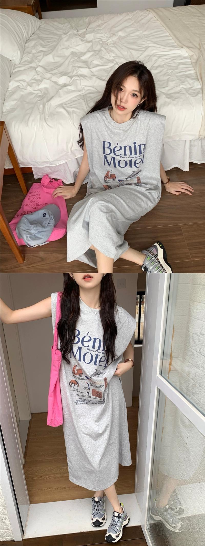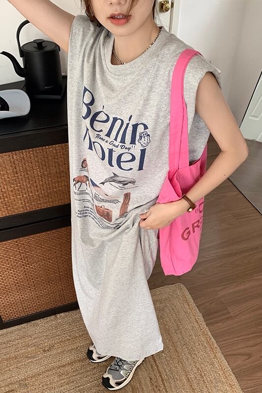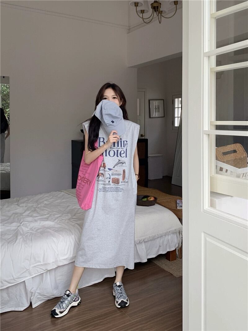 香港スタイル怠惰なスタイルのショルダーパッドドレス女性の夏の新文字プリントルーズカジュアルオールマッチノースリーブミドル丈スカート サマー 夏物 missk92715754217