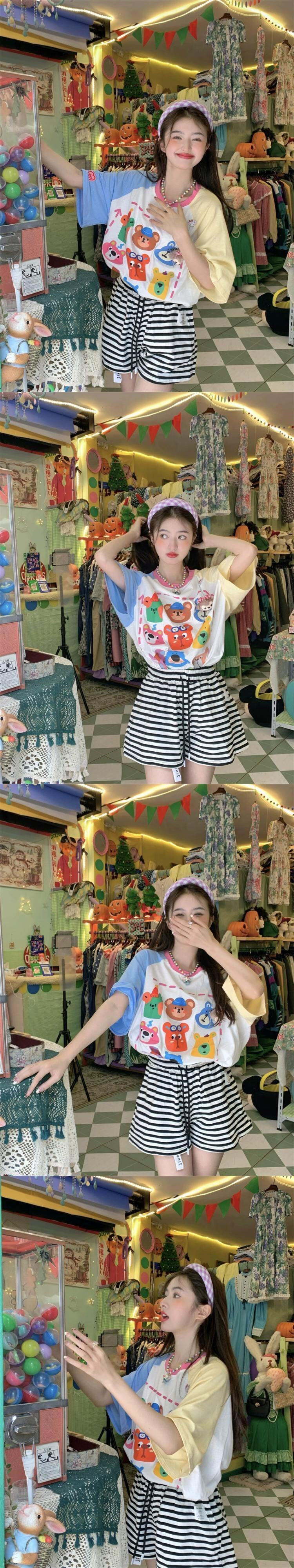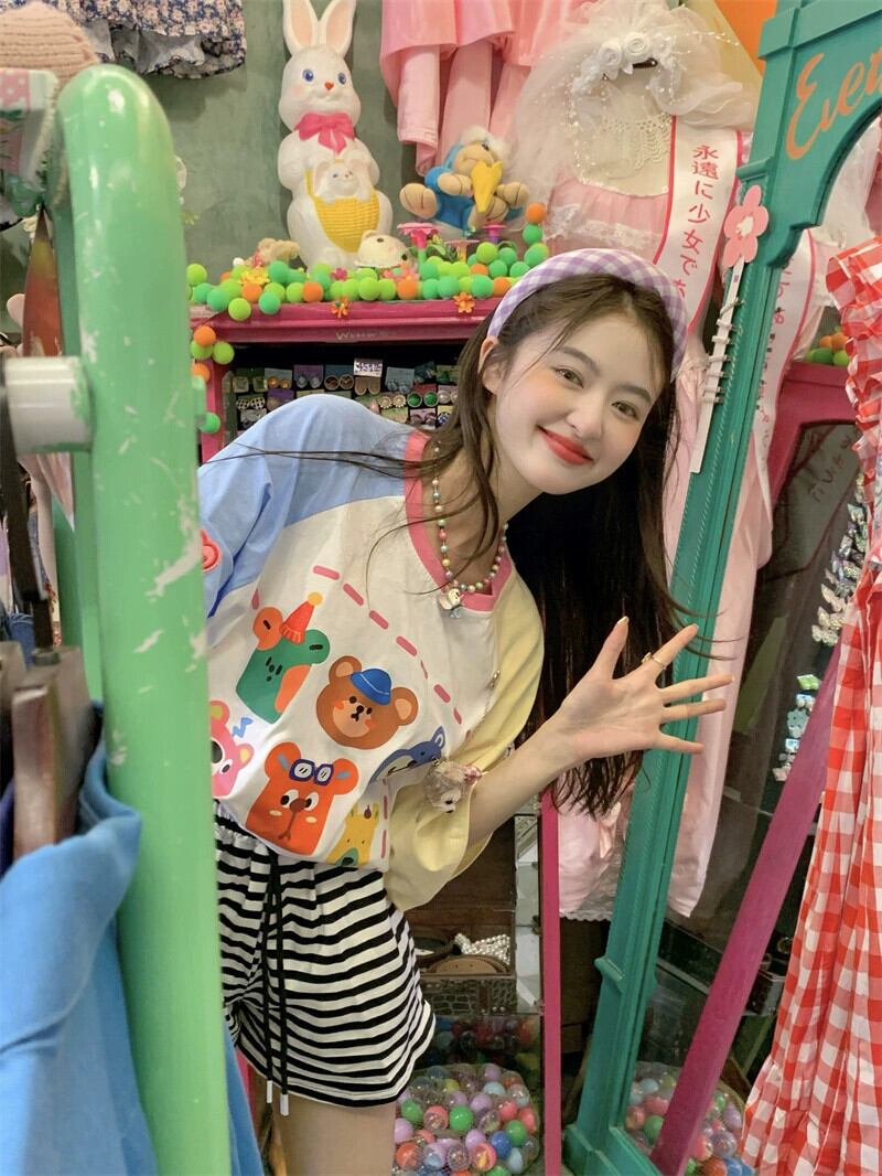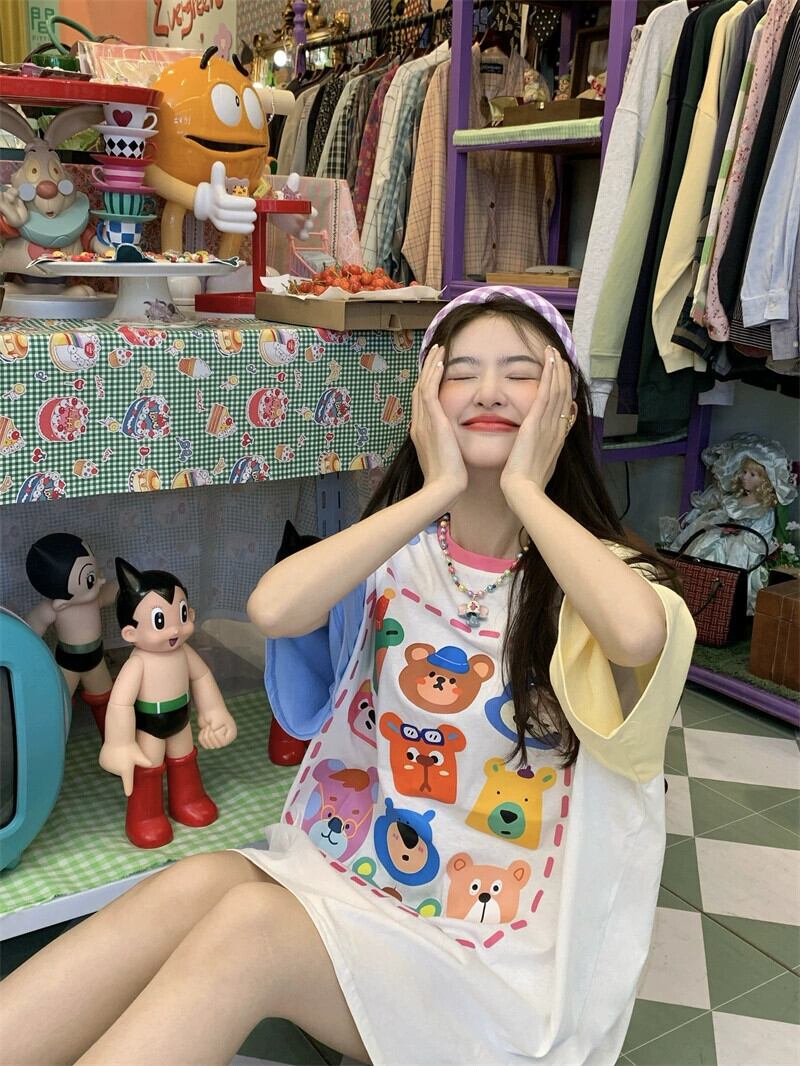 スタイルかわいいコントラストカラー半袖 T シャツ女性の夏の新しい緩い老化を軽減するプリント立体ウサギのミドル丈トップ 大人ガーリー スウィート キュート カジュアル サマー 夏物 Tシャツ missk18315883414