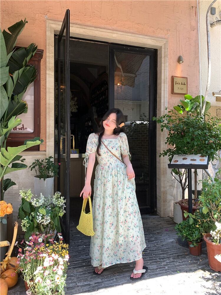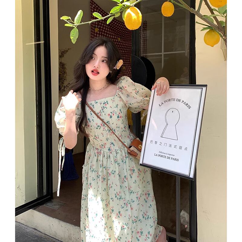 2023 夏の新しいフレンチスクエアカラーデザインセンスツーウェア気質スリムウエストパフスリーブ花柄ドレス女性 サマー 夏物 スクウェア missk75456685144