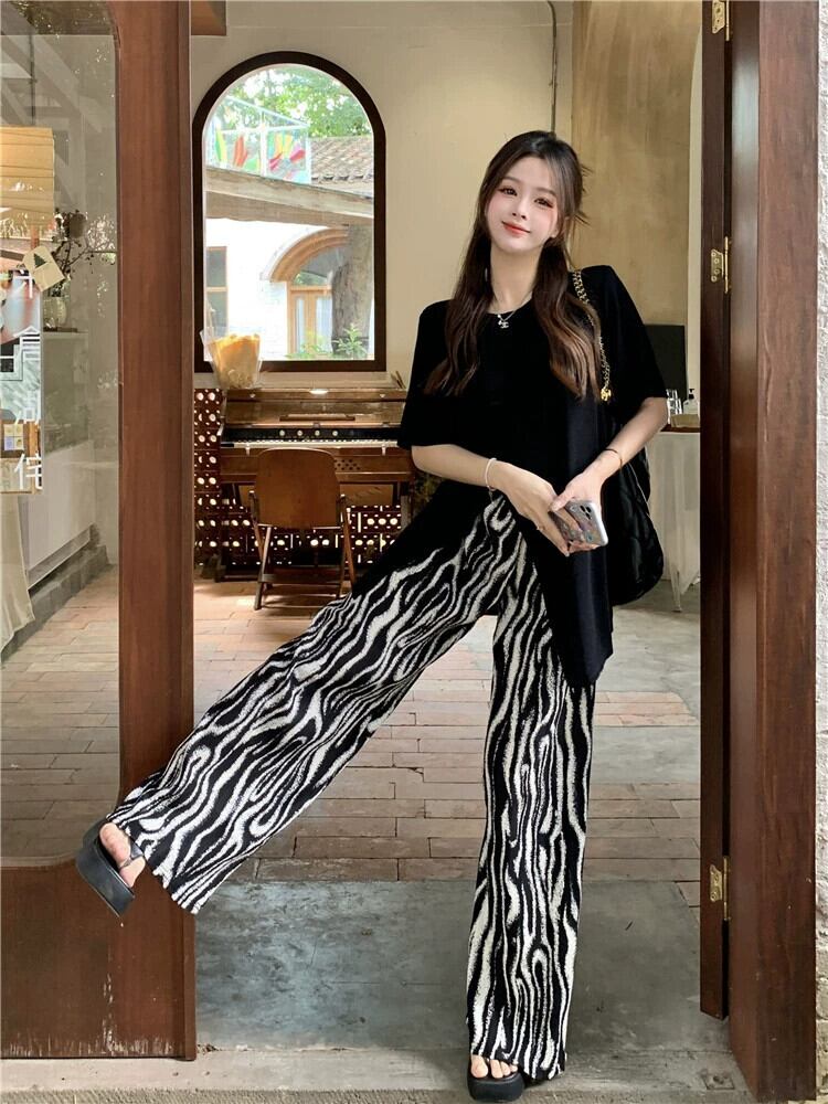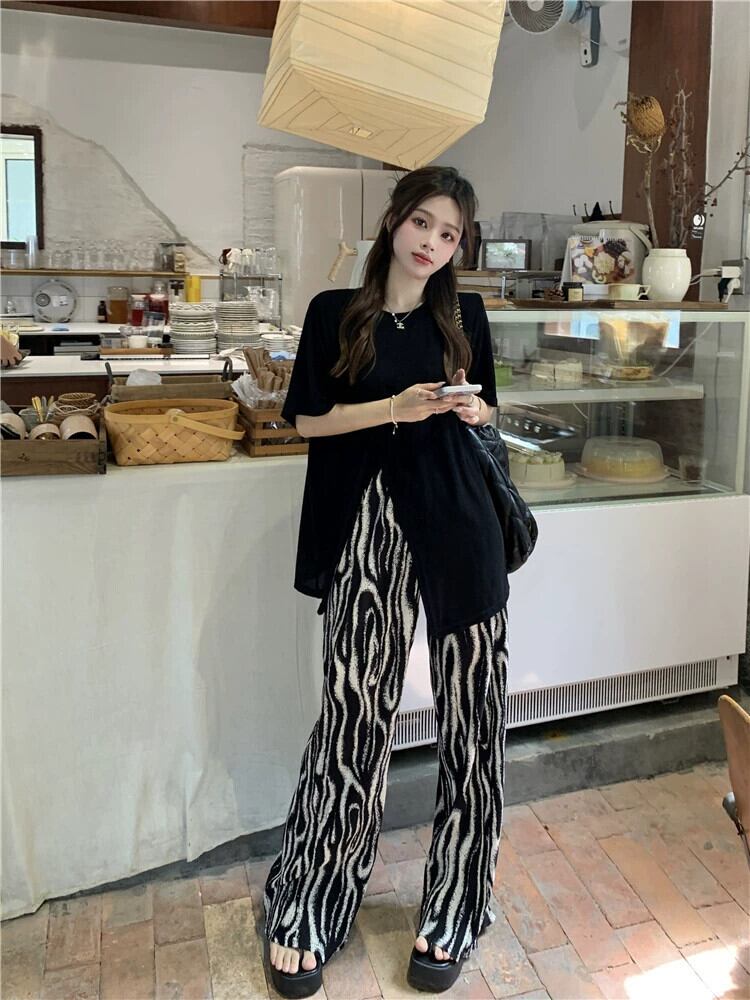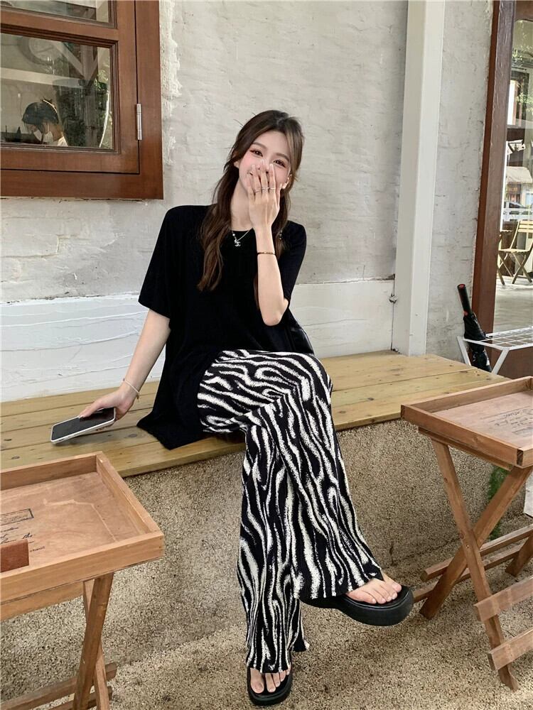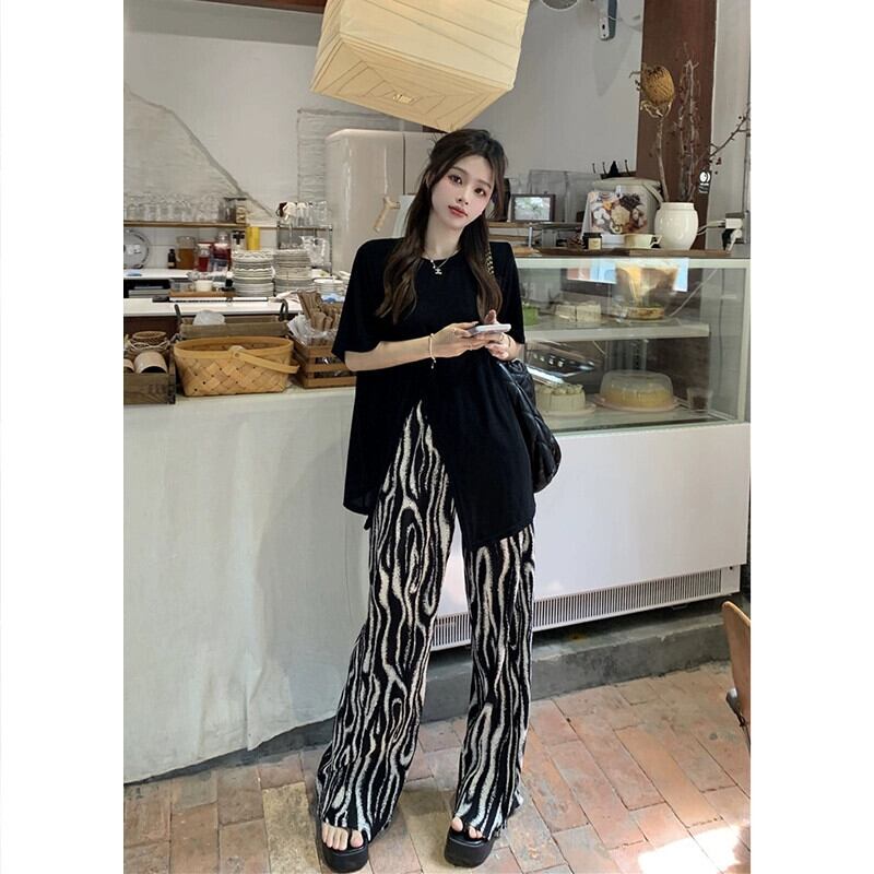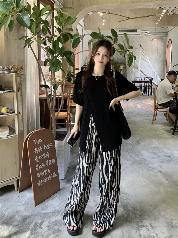 怠惰なスタイルのデザインセンス スリット ルーズ半袖 Tシャツ ハイウエスト ゼブラ柄 ワイドレッグ カジュアル パンツ レディース 夏 2 点セット ハイウェスト サマー 夏物 missk33671722573