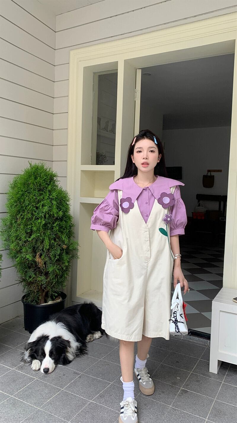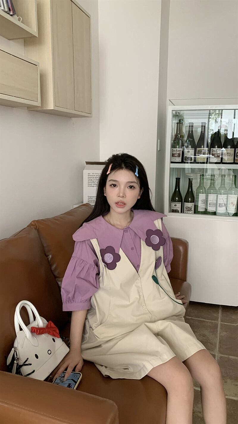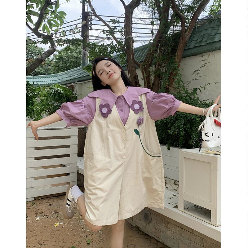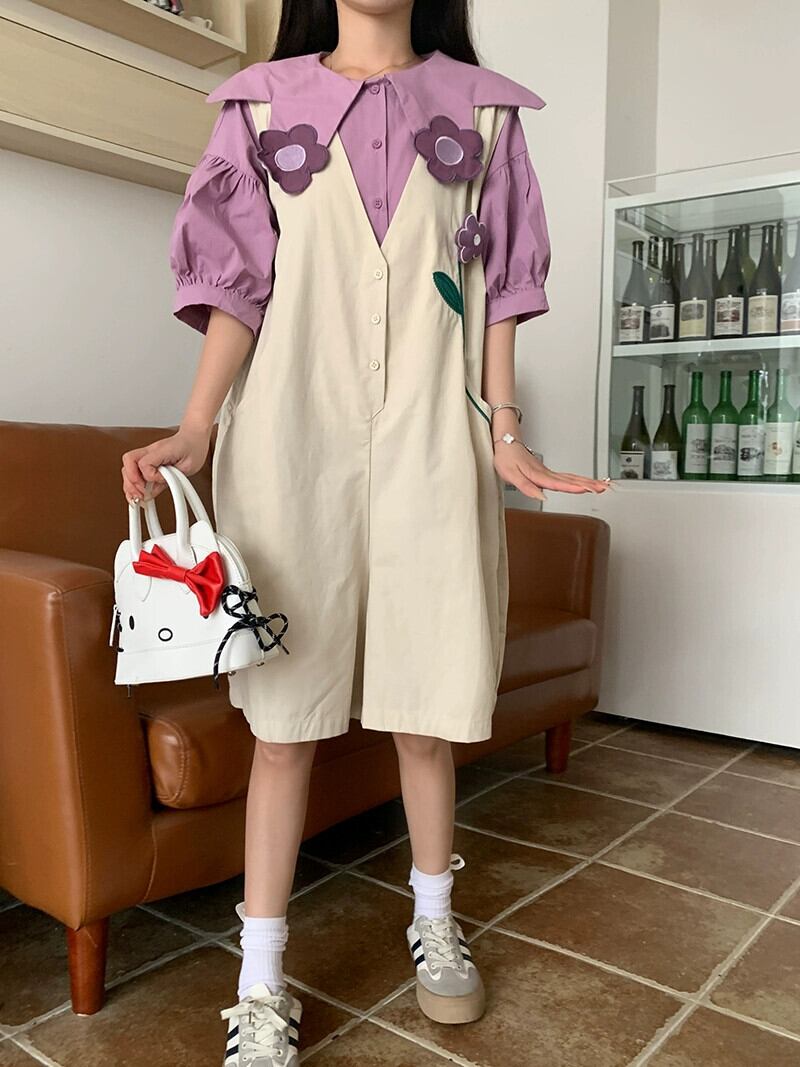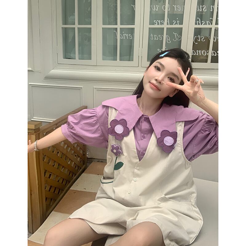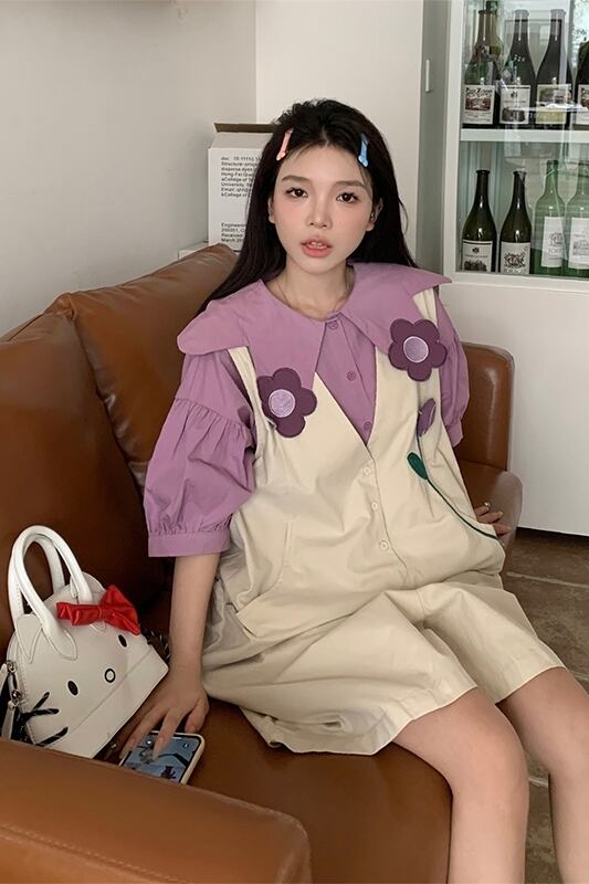 甘い年齢を軽減する不規則なドールカラー半袖シャツハイウエスト立体花オーバーオール女性の夏の新しいスーツ ハイウェスト 大人ガーリー スウィート キュート カジュアル サマー 夏物 フラワーデザイン missk44842698063