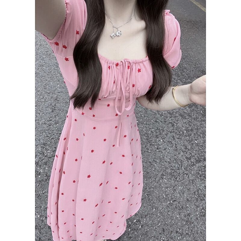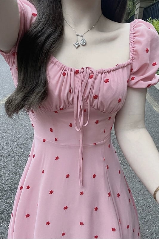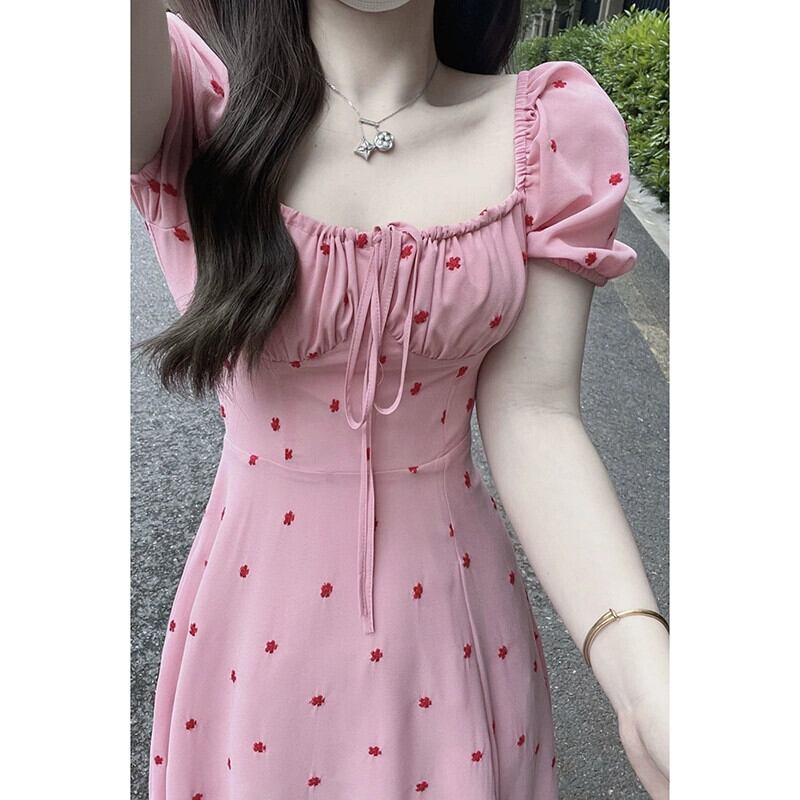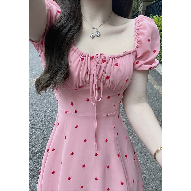 刺繍スクエアカラーネクタイパフスリーブドレス女性の夏の 2023 新しい甘いウエスト痩身ミッドレングススカート レッド 大人ガーリー スウィート キュート カジュアル サマー 夏物 スクウェア missk67145896893