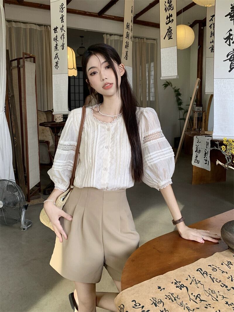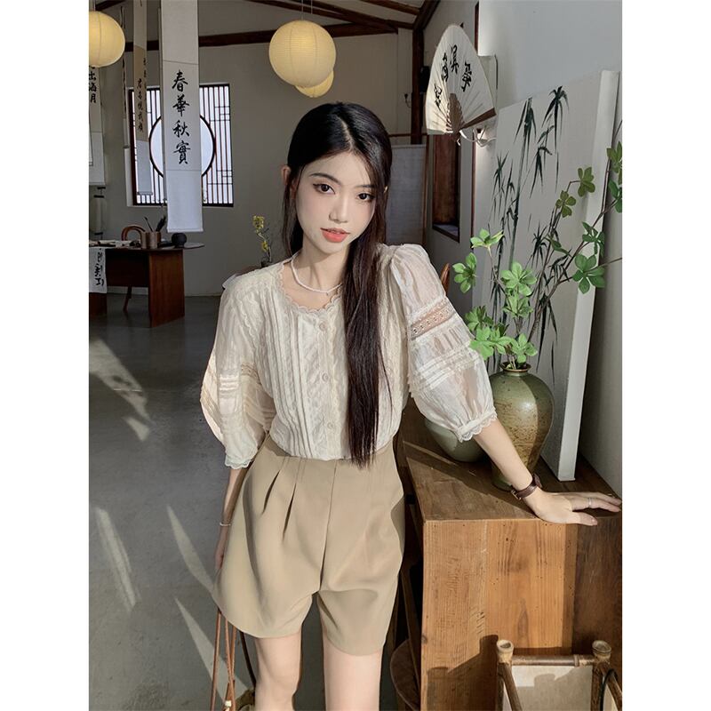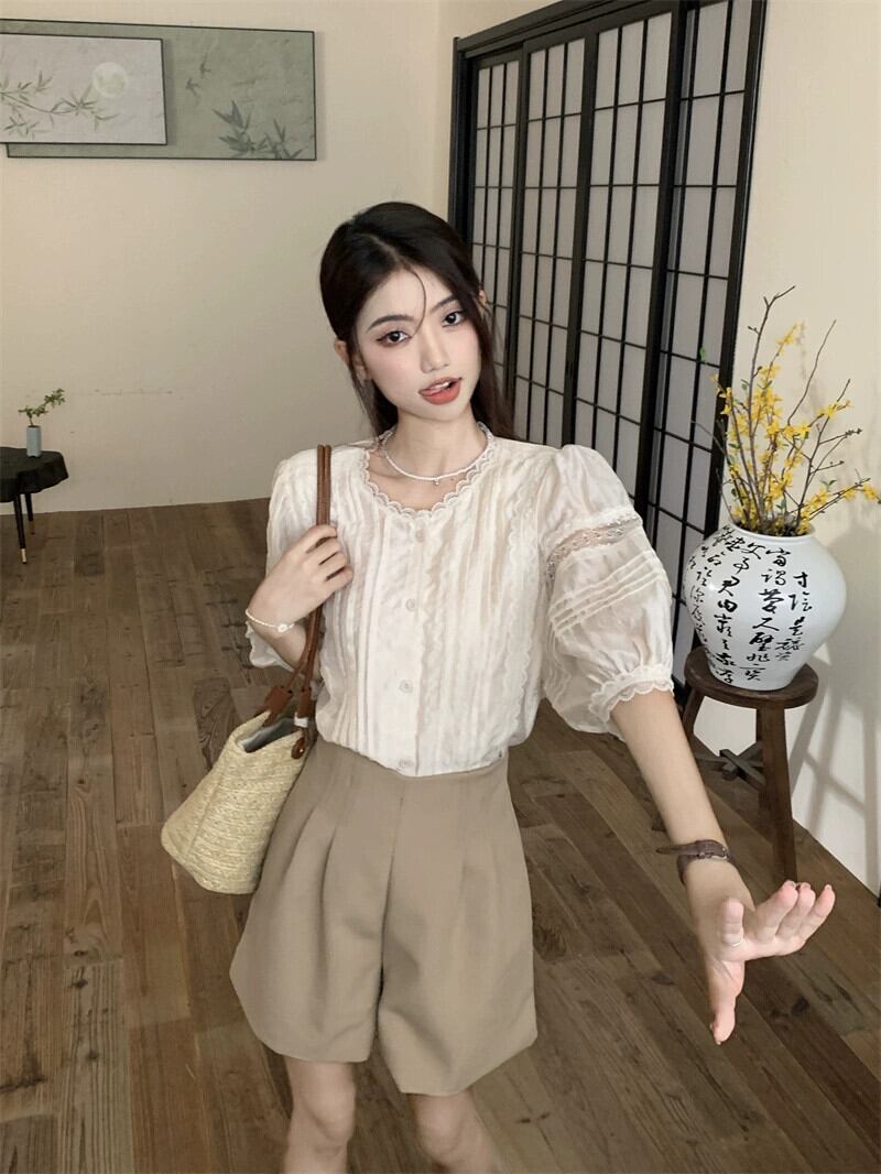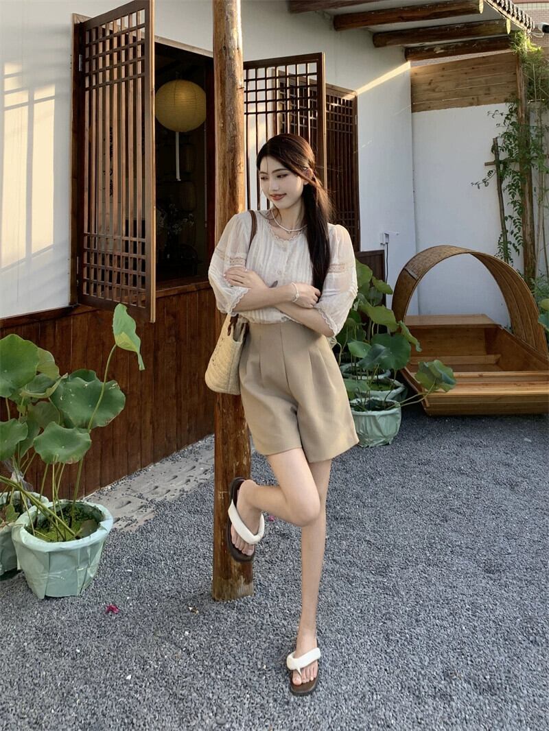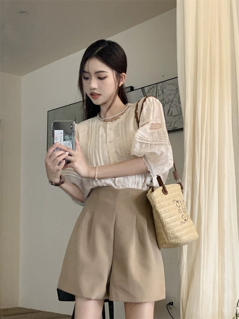 フレンチレース半袖シャツトップハイウエストワイドレッグスーツカジュアル5点パンツ女性の夏のファッションスーツ ハイウェスト サマー 夏物 missk94211259694