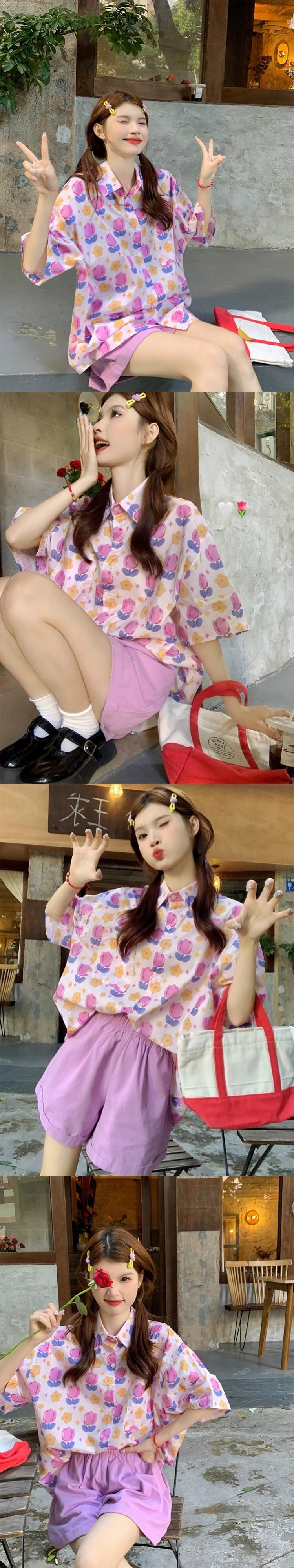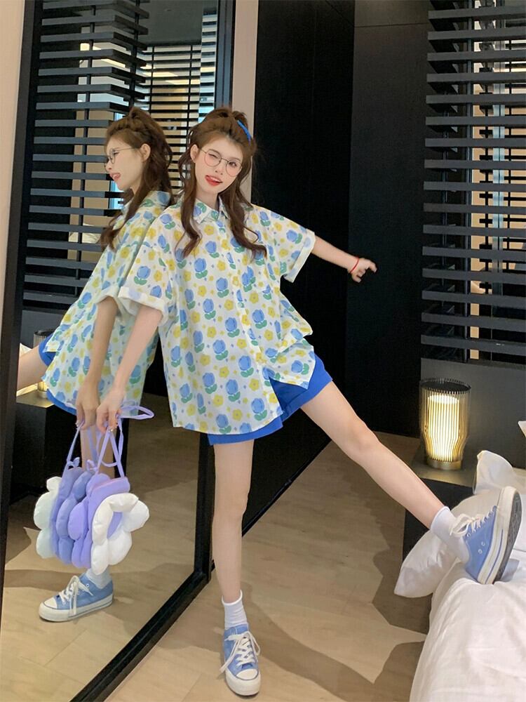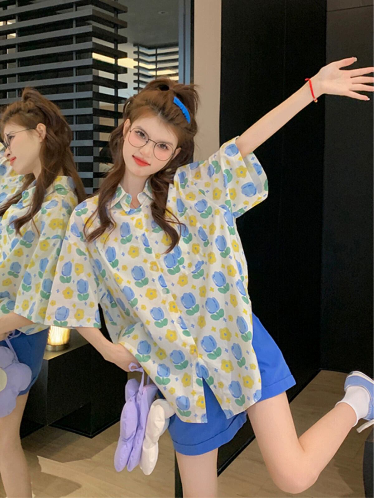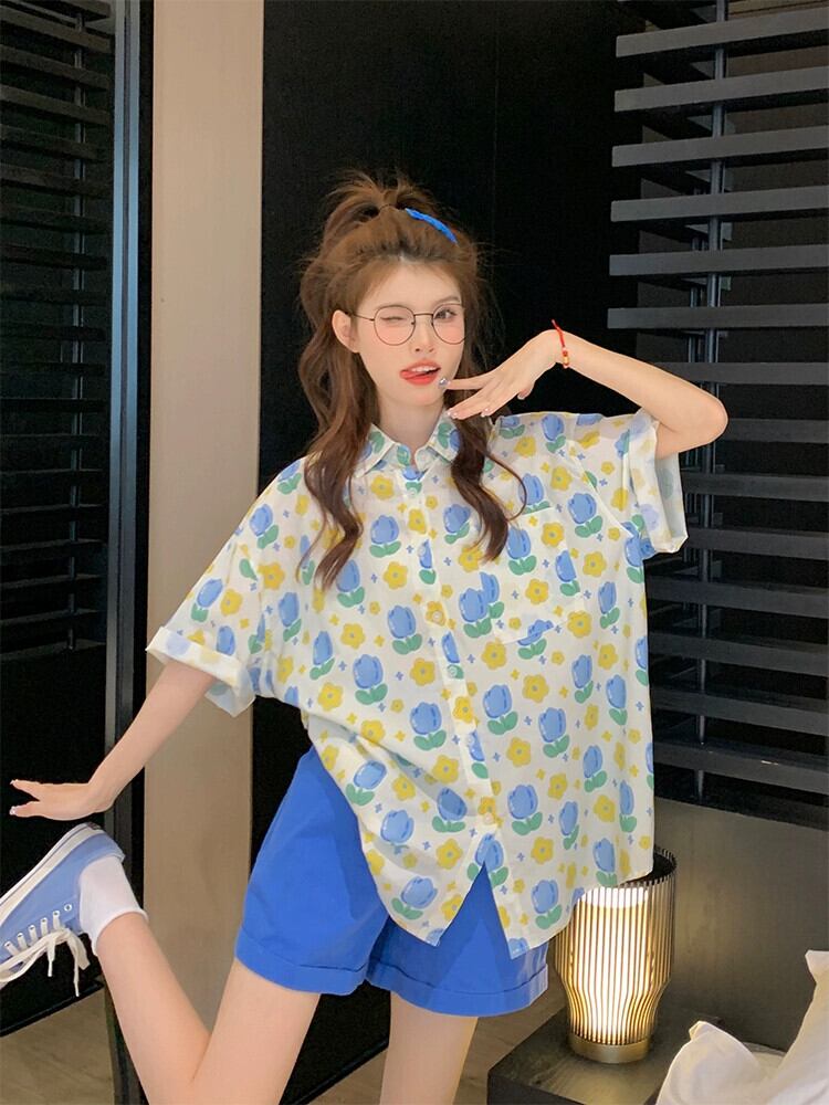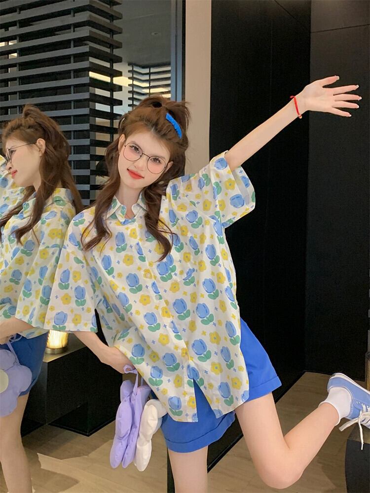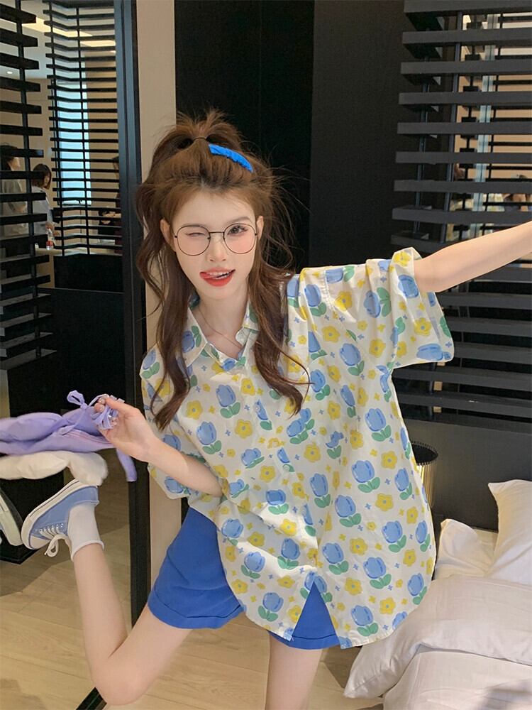 ドーパミンを着ている花柄半袖シャツ女性の夏の新しい甘くて年齢を減らすゆるいミドル丈のポロカラートップ 大人ガーリー スウィート キュート カジュアル サマー 夏物 missk32448227544