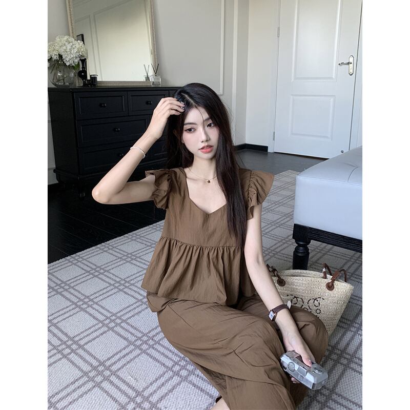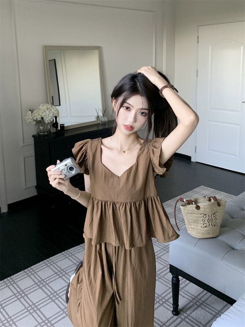 レトロなデザインセンス V ネックショートフライングスリーブシャツトップハイウエストカジュアルワイドレッグパンツレディース夏の新作スーツ ハイウェスト サマー 夏物 Vネック missk54917743275