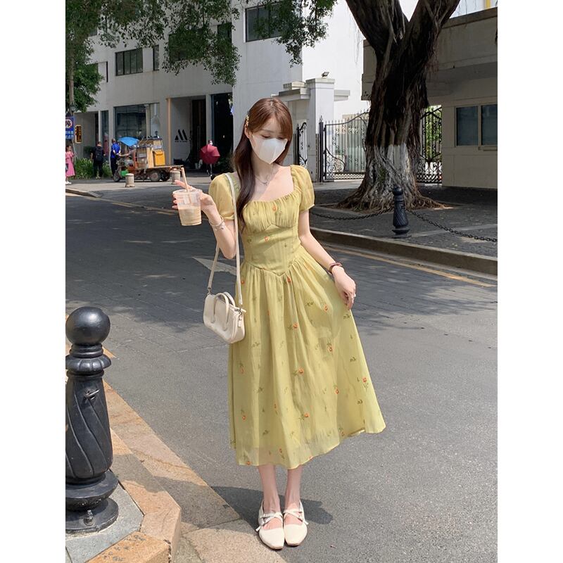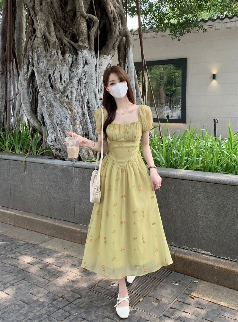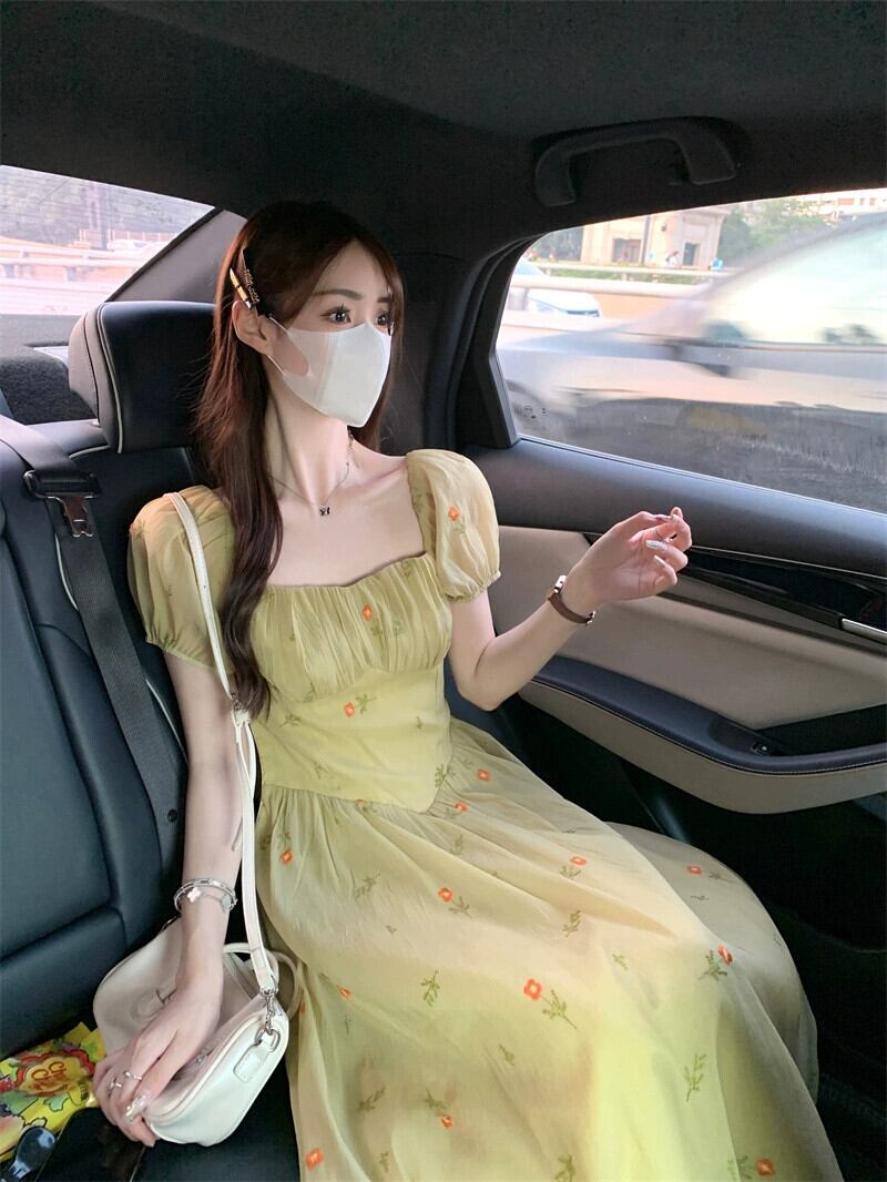 フレンチスクエアカラーレトロドレス女性の夏の 2023 新しい花刺繍シフォンステッチミッドレングスのティーブレイクスカート サマー 夏物 フラワーデザイン スクウェア missk19507763747