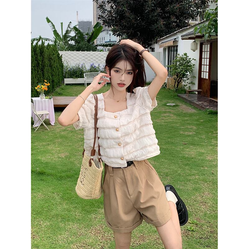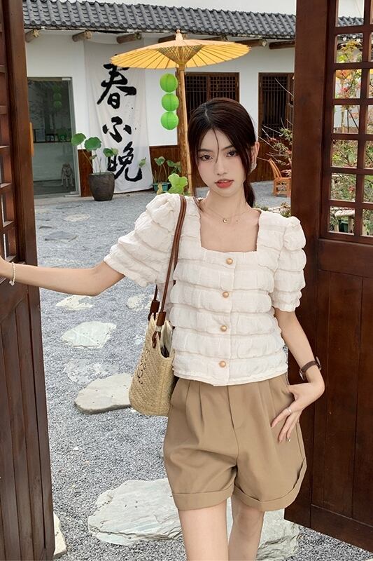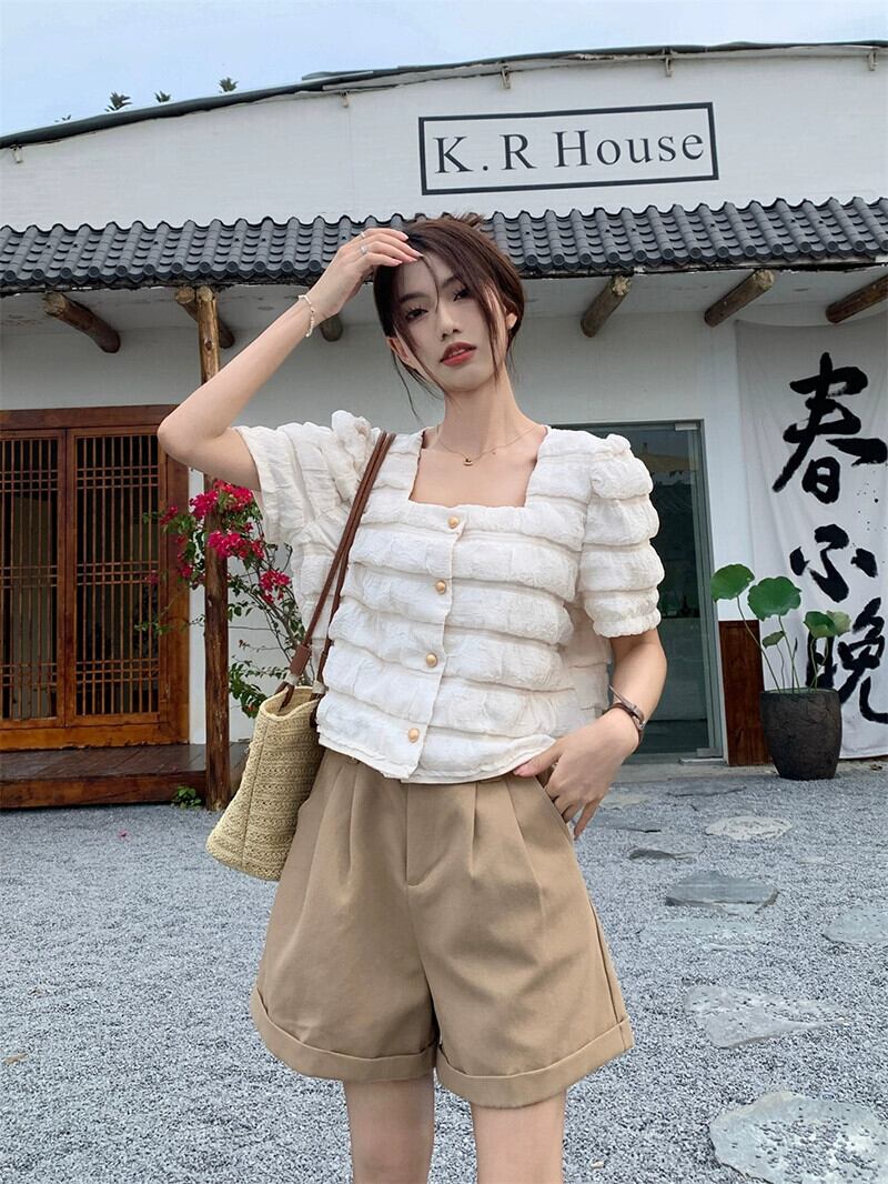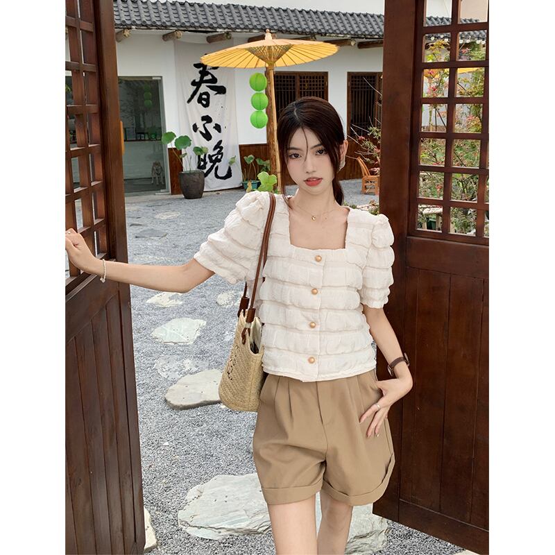 テクスチャードスクエアカラーパフスリーブシャツレディース2023年夏新作フレンチニッチルーズショート半袖トップ レッド サマー 夏物 スクウェア missk32931969127